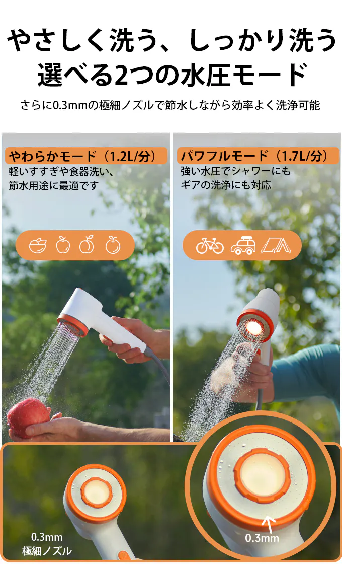 選べる2つの水圧モードにより、1.2L/分のやわらかモードは顔や子どもへのシャワーに、1.7L/分のパワフルモードは洗車やアウトドア用品の洗浄にと、用途に合わせた最適な水流が使えます。