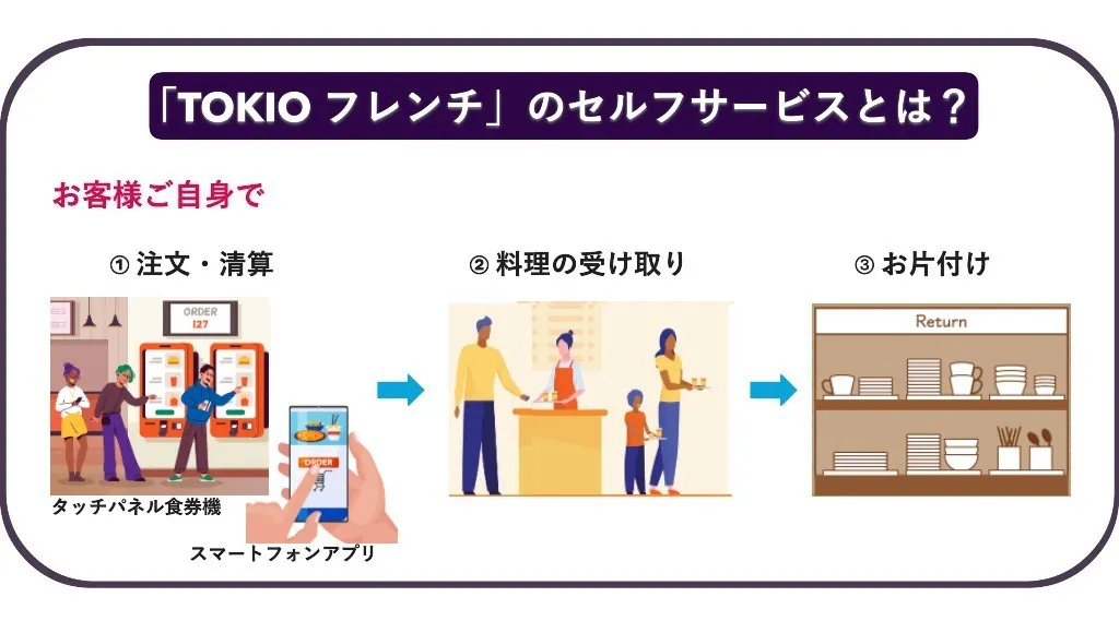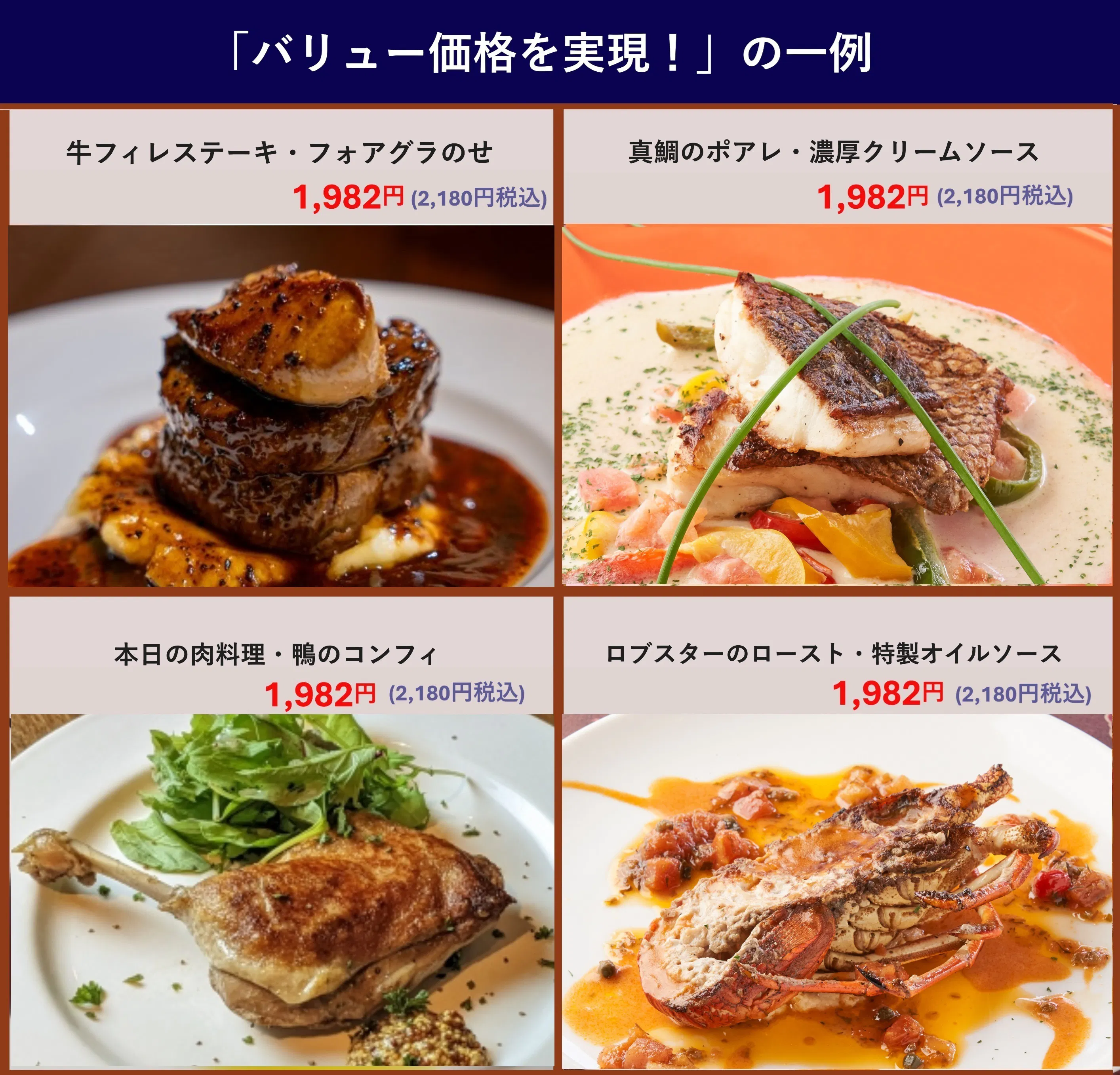 お客様に①②③をお手伝い頂くことで、「ホールスタッフの人件費を削減」し、食材にコストを集中し、「バリュー価格を実現!」しました。