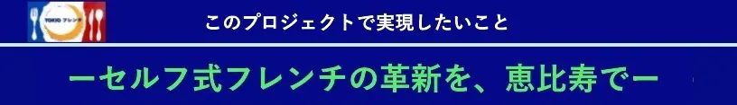 このプロジェクトでは、東京都渋谷区にて、セルフサービス&サスティナブルなフランス料理店「TOKIOフレンチ」恵比寿店のオープンを目指しています。