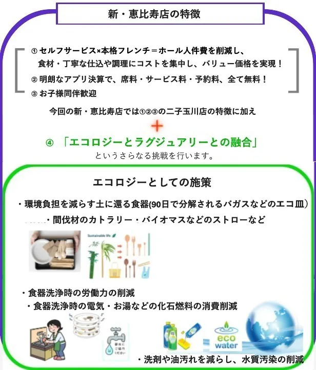 私たちの”夢”はまだ道半ばです。「本格的な味わいを、もっと気軽に」「美味しい時間が地球にも優しいものであってほしい」「働くスタッフにも誇りある未来を届けたい」これらの想いをカタチにするために、次なる挑戦として、よりアクセスのよい東京都心の恵比寿に新たな支店を開業する運びとなりました。土日は予約困難なほどの人気店となった二子玉川の「TOKIOフレンチ」ですが、都心部からアクセスが難しいとの声も多く届いてました。恵比寿に 新店舗を構えることで、新たな顧客へのアプローチとサービスの最適化を目指します。