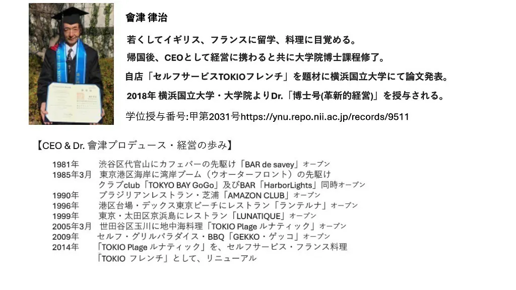 はじめまして、二子玉川セルフサービス「TOKIO フレンチ」を運営している株式会社パラディ・ラボ、CEO&Drの會津です。