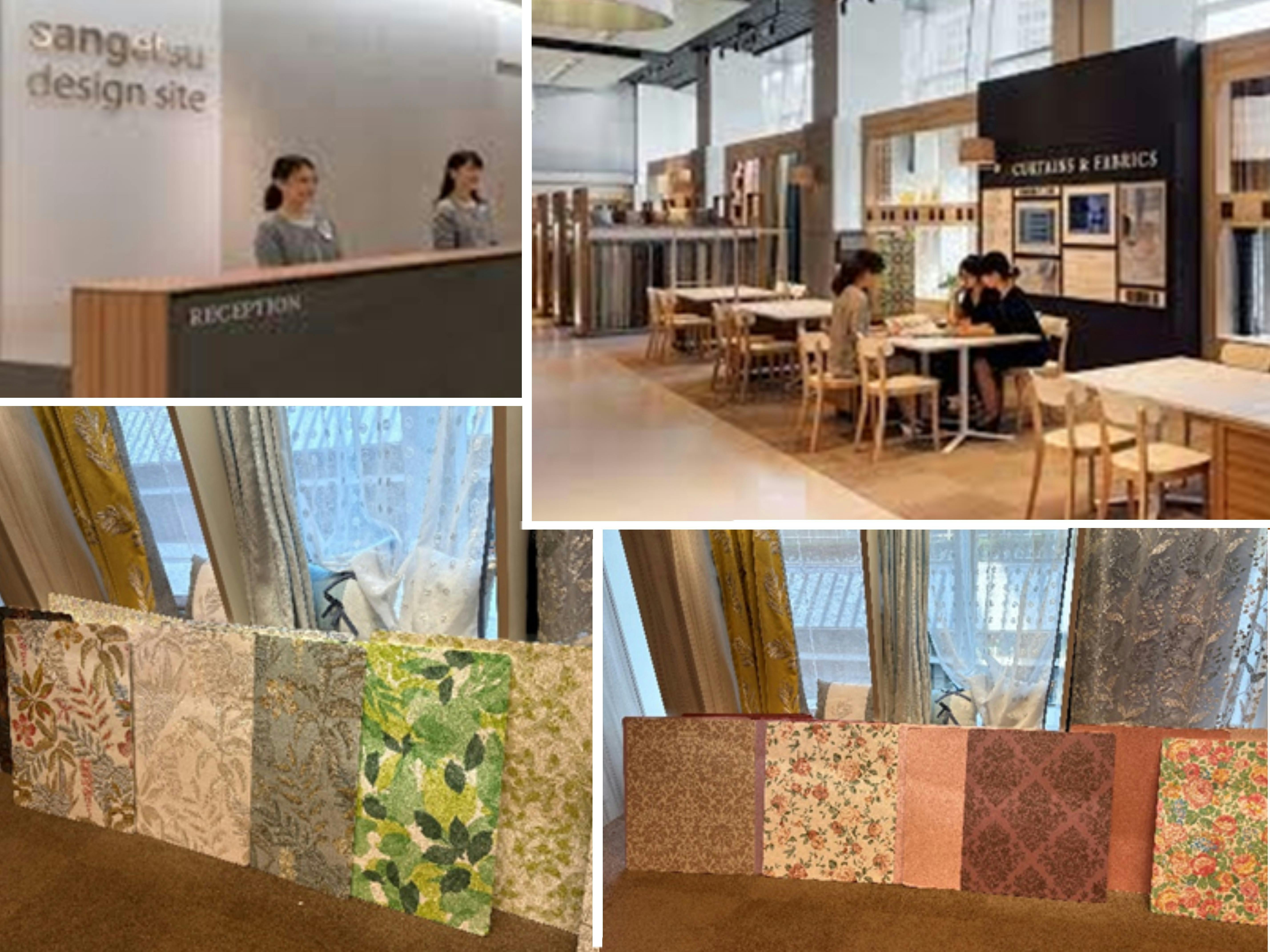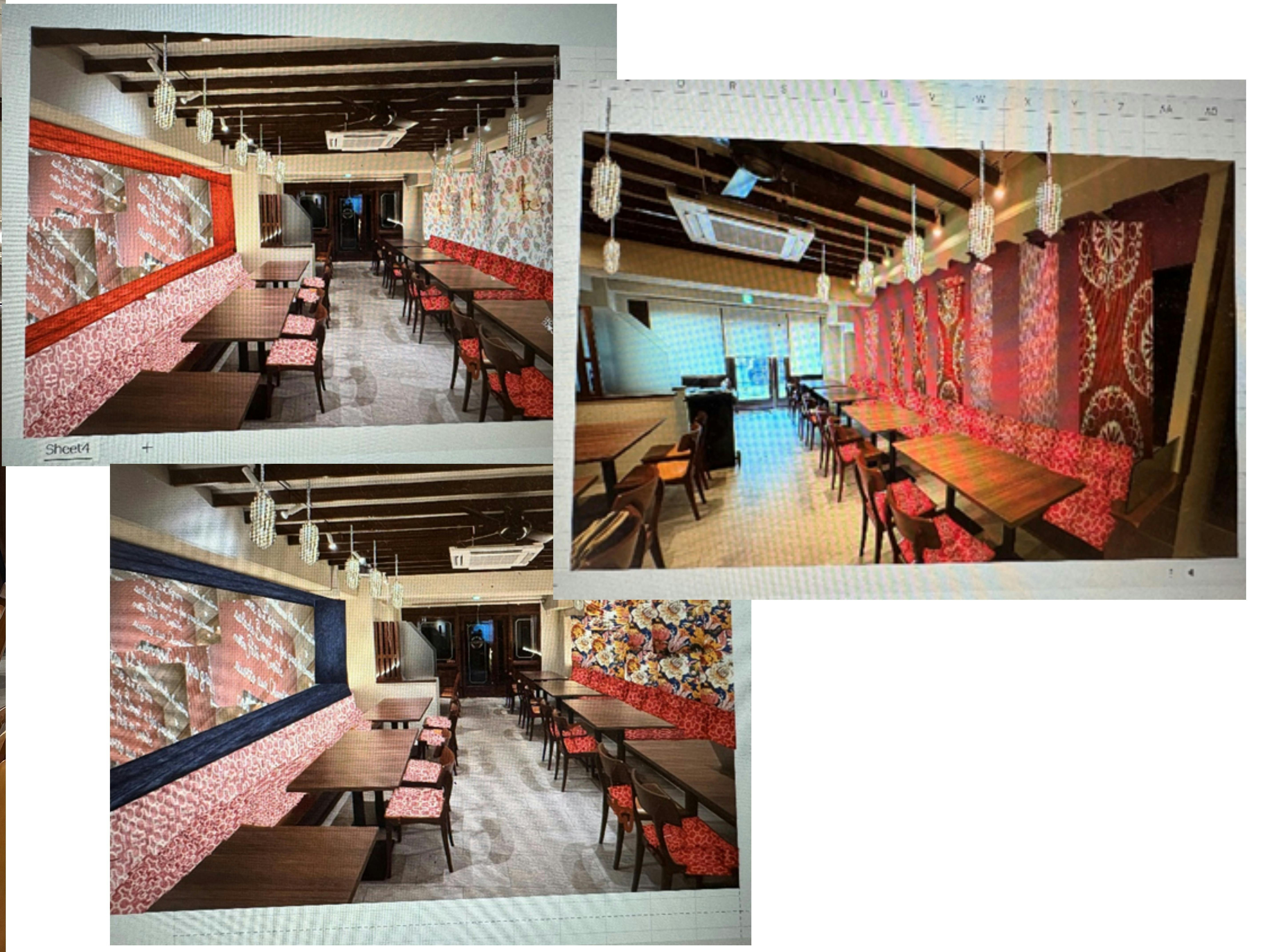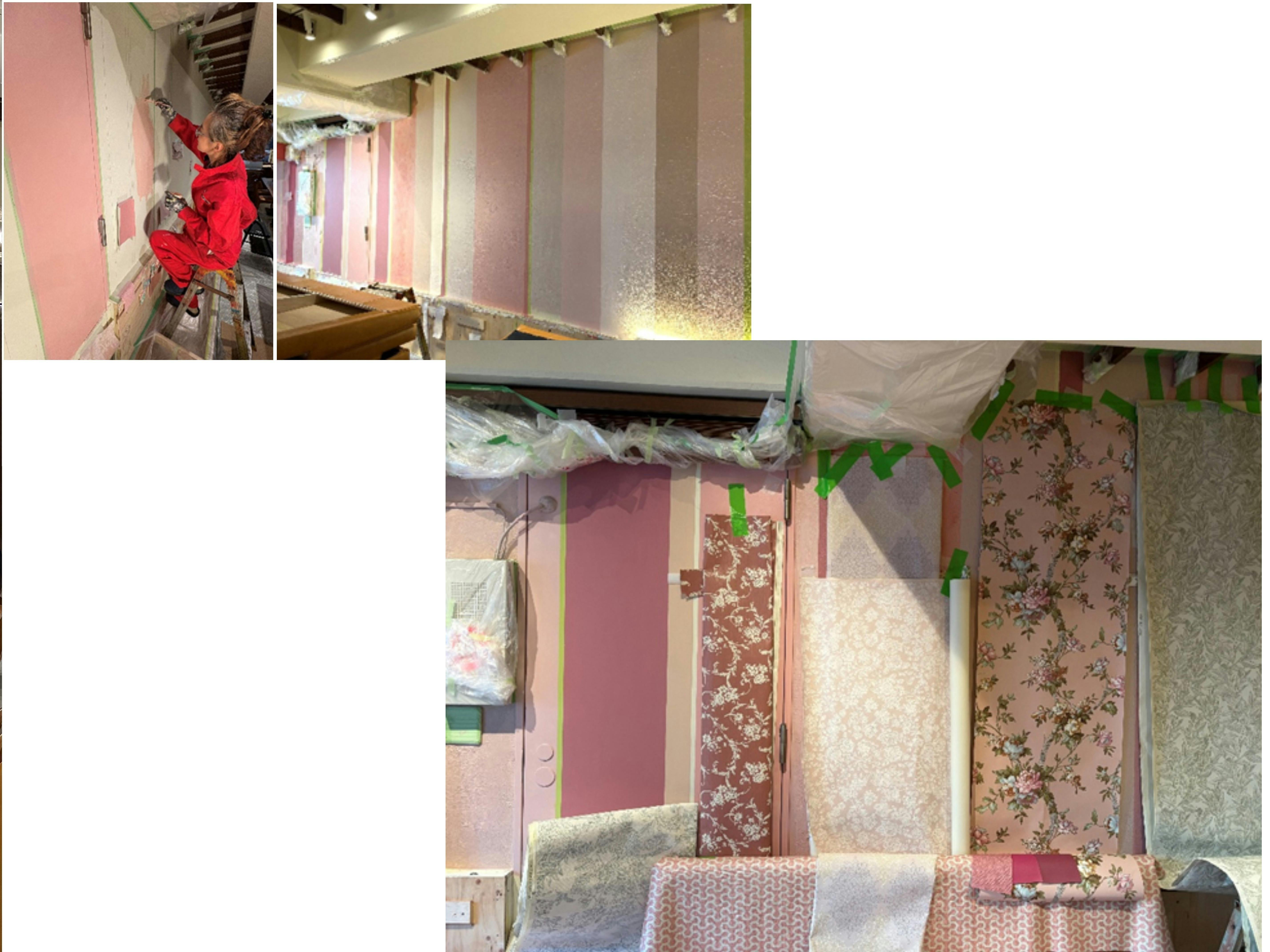 内装の検討は9月20日位から始めてました。まずは可能な工法を考慮して、大まかな色使いを決めました。その時のCGシミレーションです。なんとなーく決まったので、9月28日、私(鍋島)の大好きな場所「サンゲツショールーム」へ!このショールームは大きなサンプルで検討できるので、便利です!ピンクに塗まくった壁に「どの壁紙にしようかな~」と検討中の図。
