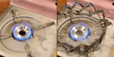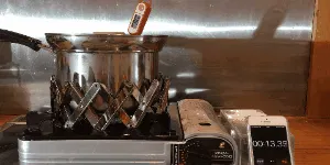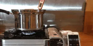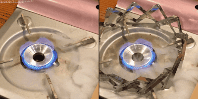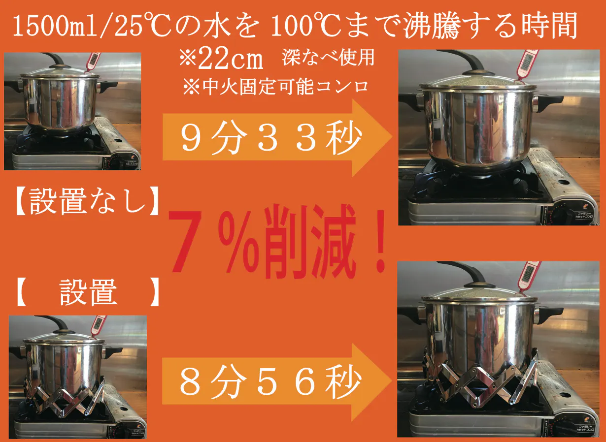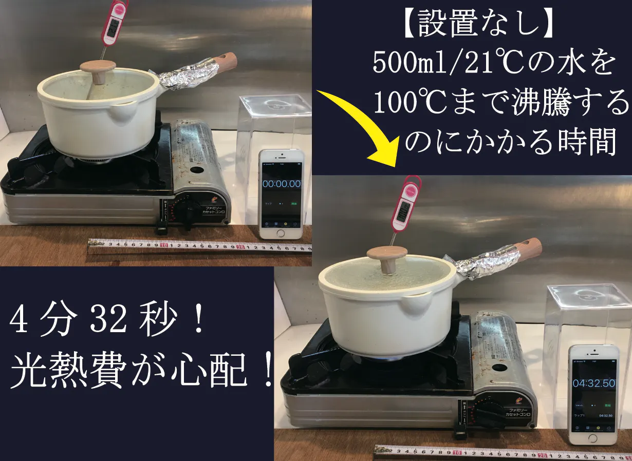 ※実験は東邦金属工業K-31HPファミリーカセットコンロ及び推奨ガスカートリッジを使用して室温22℃の環境下にて行われています。カセットコンロでの使用の際はメーカーの取扱説明書をよくお読みの上、ガスカートリッジ上に本製品や鍋などがかからないように注意してご使用ください。特にコンパクト設計の一部カセットコンロではご使用できない場合がございます。