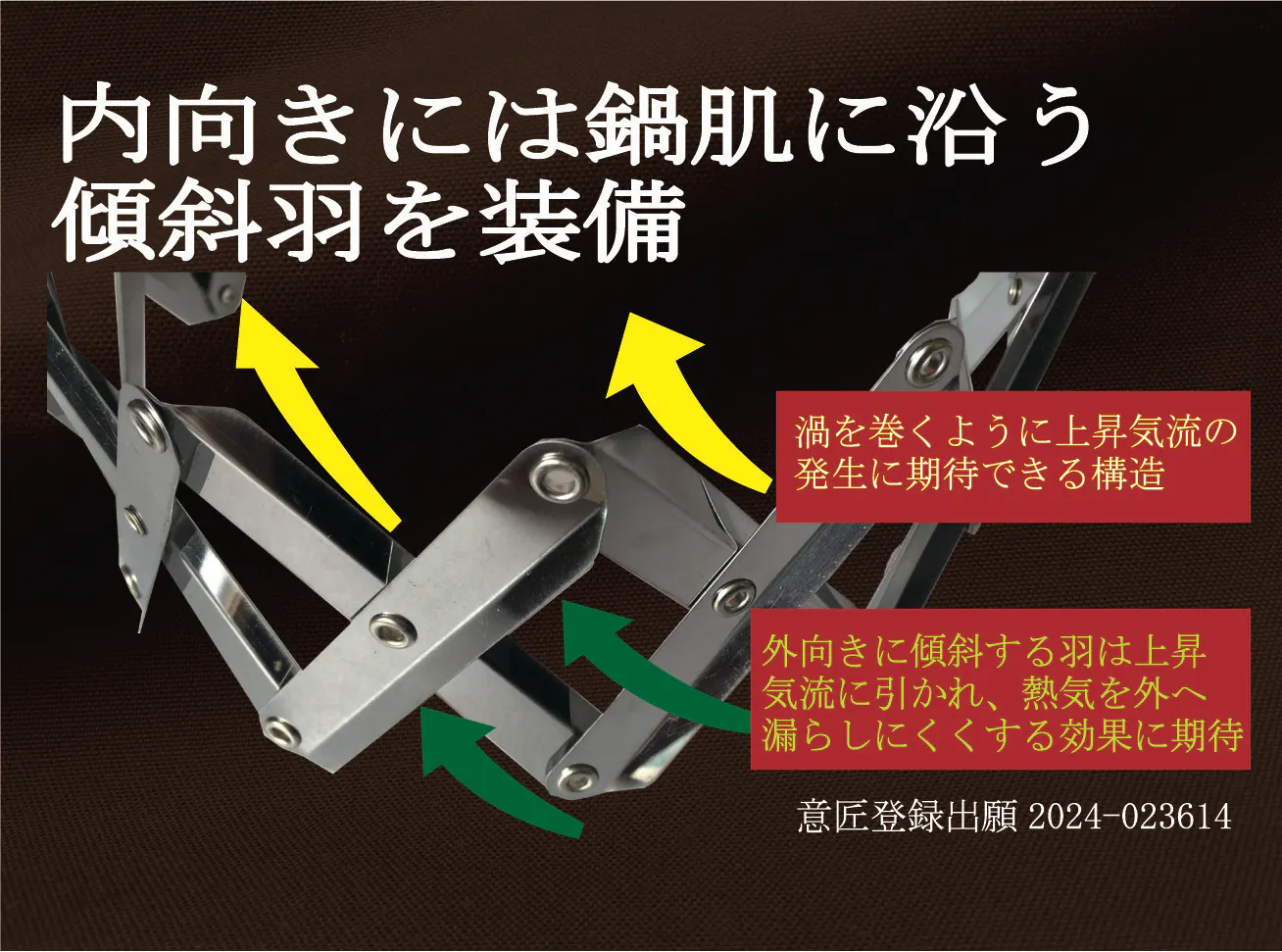 内側のブレードには斜めに折れ曲がった羽根が設けてあります。そのためコンロの熱気が横方向へ逃げるのを斜めの上昇気流に誘引する効果が期待でき同時にトルネード状の上昇気流を誘引しています。