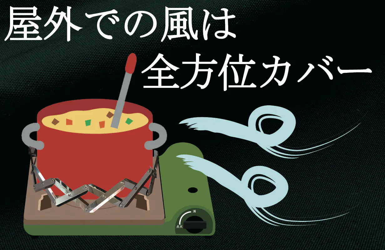 屋外の風はあらゆる方位から吹いてきます。三方を囲う防風板はキャンプギアなどでよく見ますが巻き返しの風には不向きです。コンロの周りを囲うことにより全方位防風効果が期待できます。にて
