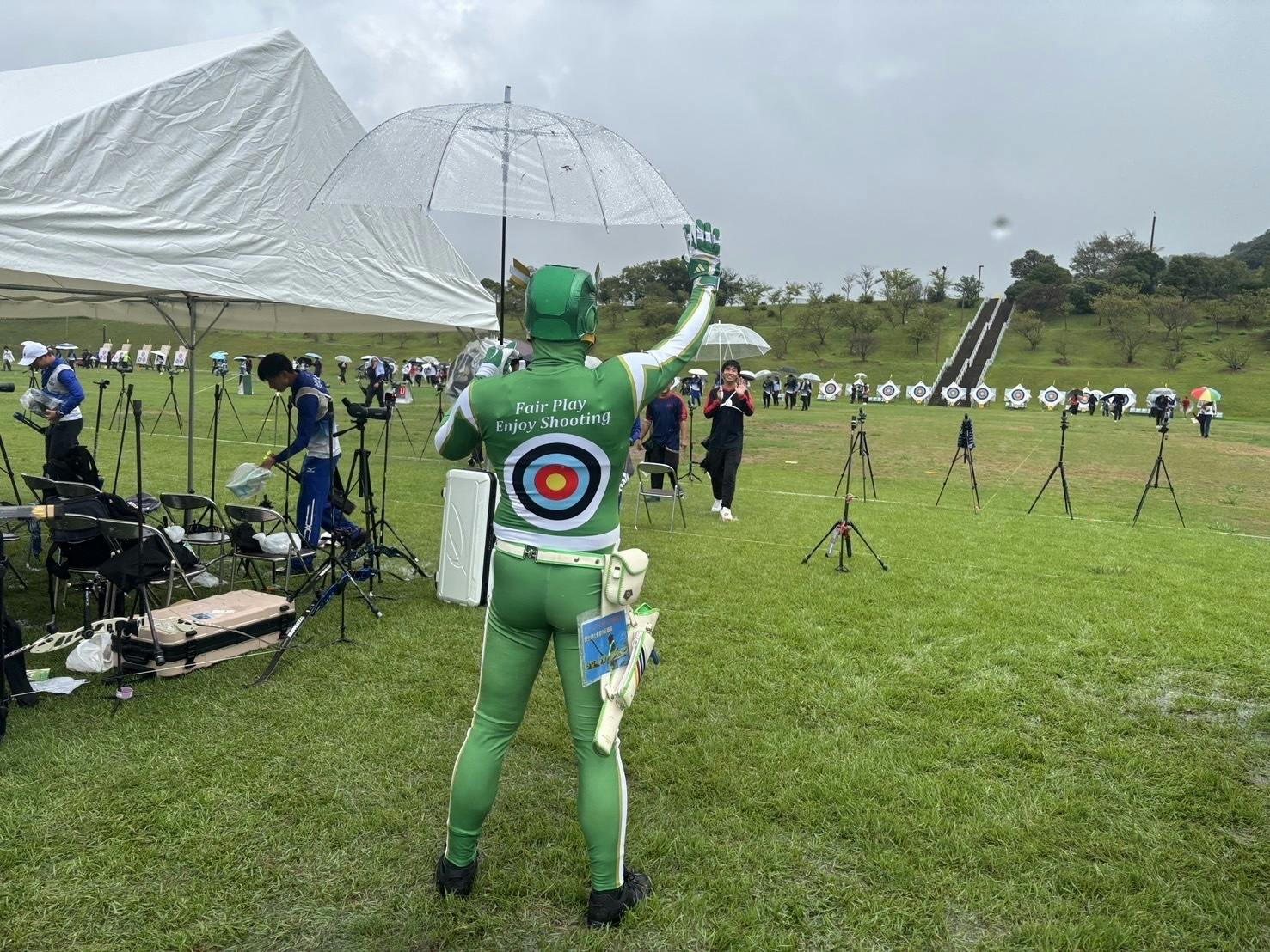 そんな中でもグリーンアーチャマンの登場にビックリしつつも、スマホのインカメラで一緒に映ってくださる選手もいて、本当に嬉しい限りです。そんなグリーンアーチャマンも矢取りから帰ってくる選手に手を振ったりと、全力で応援させていただきました。