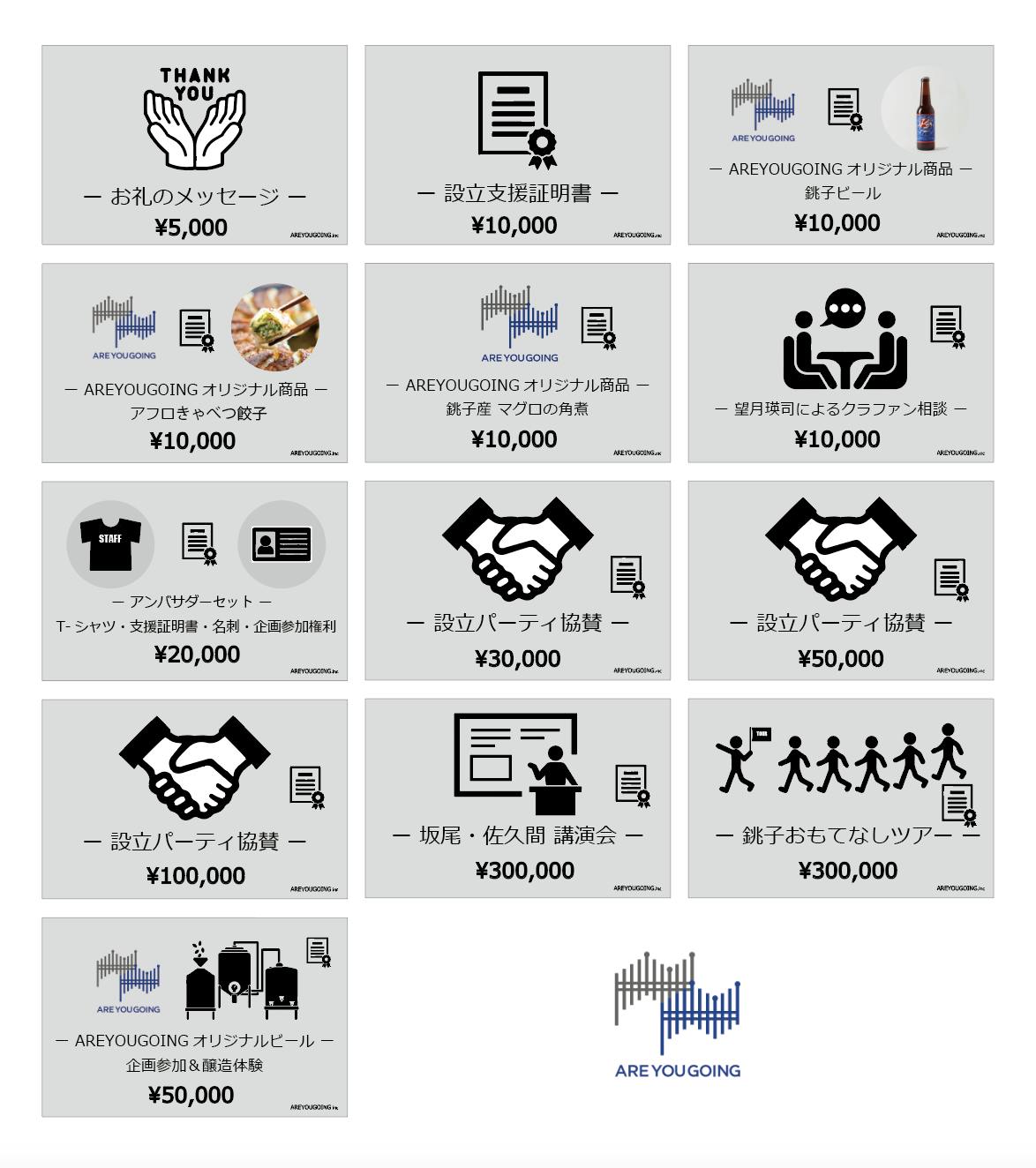 2025/12/27 11:34【ARE YOU GOING クラウドファンディング|リターン紹介】多くのご支援頂き本当にありがとうございます!今回のクラファンでは、「応援したい」「関わりたい」「一緒に作りたい」そんな想いに応えられるリターンを幅広くご用意しています。 お礼のメッセージ(¥5,000)まずは気軽に応援したい方へ。感謝の気持ちを込めてお届けします。 設立支援証明書(¥10,000)ARE YOU GOINGの立ち上げを支えた証として、証明書を発行します。オリジナル商品 各種(¥10,000〜)・銚子ビール・アフロ餃子・角煮ここでしか手に入らない限定アイテムです クラファン相談(¥10,000)これから挑戦したい人向け。企画・方向性の壁打ちを行います。 アパレルセット(¥20,000)Tシャツ+支援証明書+名前掲載ARE YOU GOINGの仲間として一緒に走りましょう。 設立パーティ協賛(¥30,000〜¥100,000)協賛者としてしっかりご紹介します。 講演会(¥300,000)坂尾・佐久間によるリアル講演。挑戦・地域・事業づくりをテーマにお話しします。 銚子おもてなしツアー(¥300,000)実際に現地へ。食・人・空気を体感してもらう特別な体験型リターン。オリジナル商品企画参加&醸造体験(¥50,000)一緒に“商品を作る側”へ。クラウドファンディング終了まであと、3日になりました!沢山の応援、ご支援本当にありがとうございます!最後に必ずプロジェクト成功させたいと思っているので、ぜひ応援の程をよろしくお願いいたします!#クラウドファンディング#クラファン#挑戦#銚子市 もっと見る