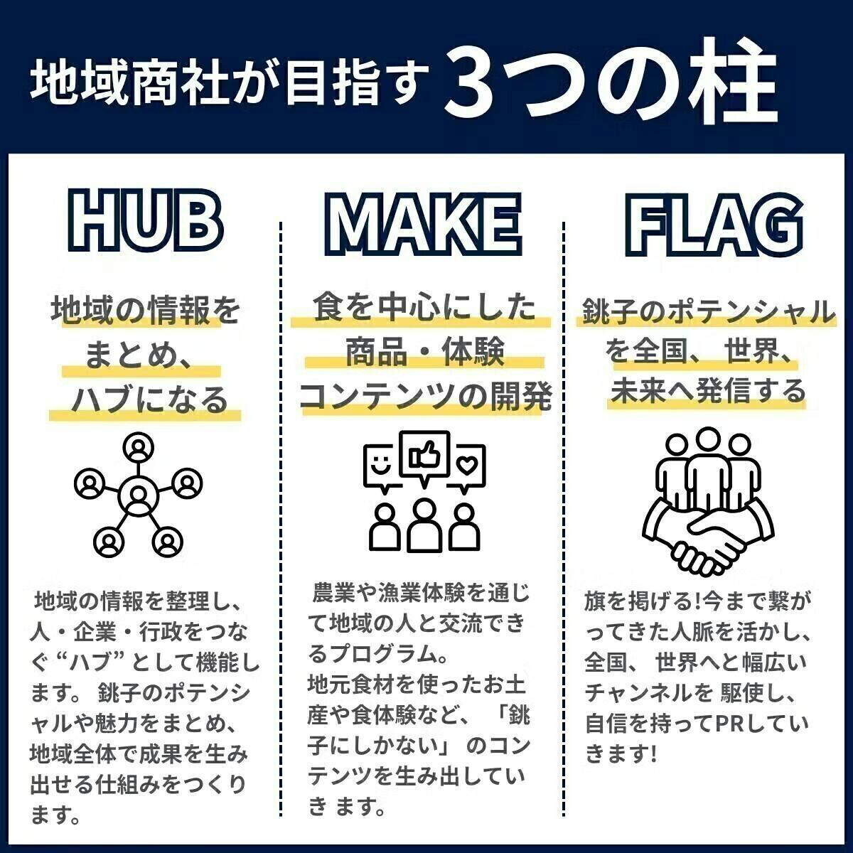 HUB & FLAG プロジェクト 地域の未来に旗を立てる。銚子をつなぐハブになる。地域商社がハブとなることで、分散していた取り組みを一箇所にまとめ、最後まで実行につなげていきます。