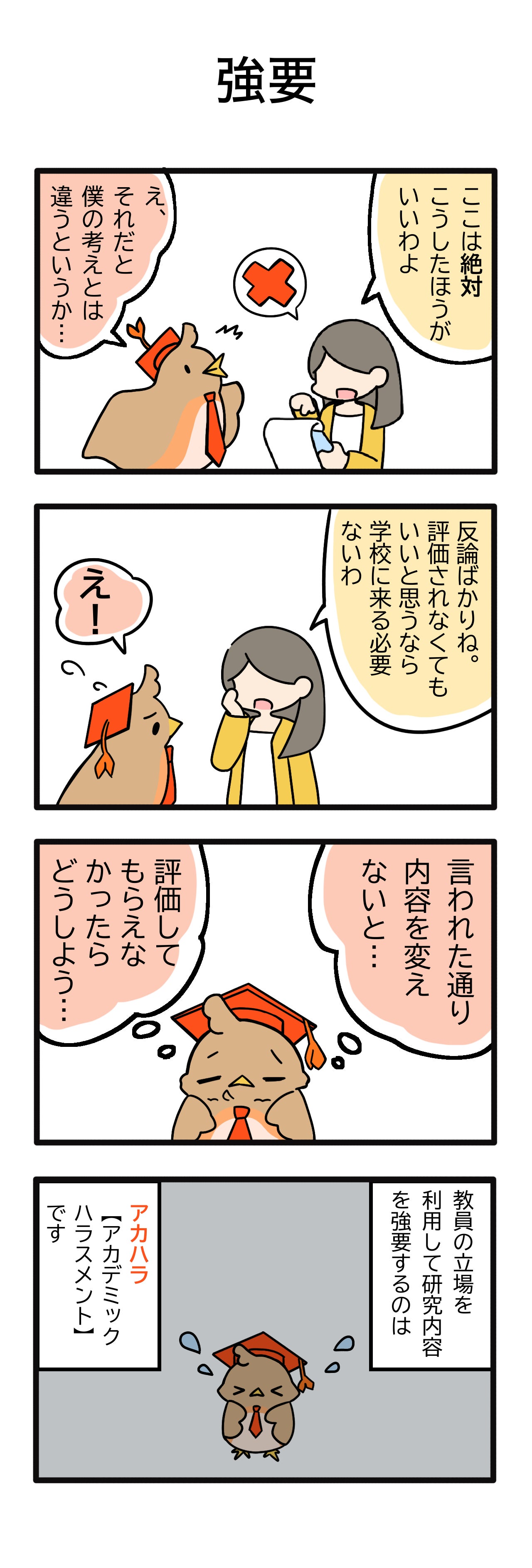 専門学校、短大、大学、大学院等の高等教育機関で、立場が上の者(多くは教員)が、立場が下の者(多くは学生)に対して、理不尽な差別、暴言、暴力、学習環境の妨害、研究テーマの強要、単位を与えない、などの「いじめ」を行うことをアカデミック・ハラスメント(アカハラ)といいます。これらのハラスメントによって将来への夢や希望を断たれ、心を病み、自殺という最悪の結果が起きている事例もあります。