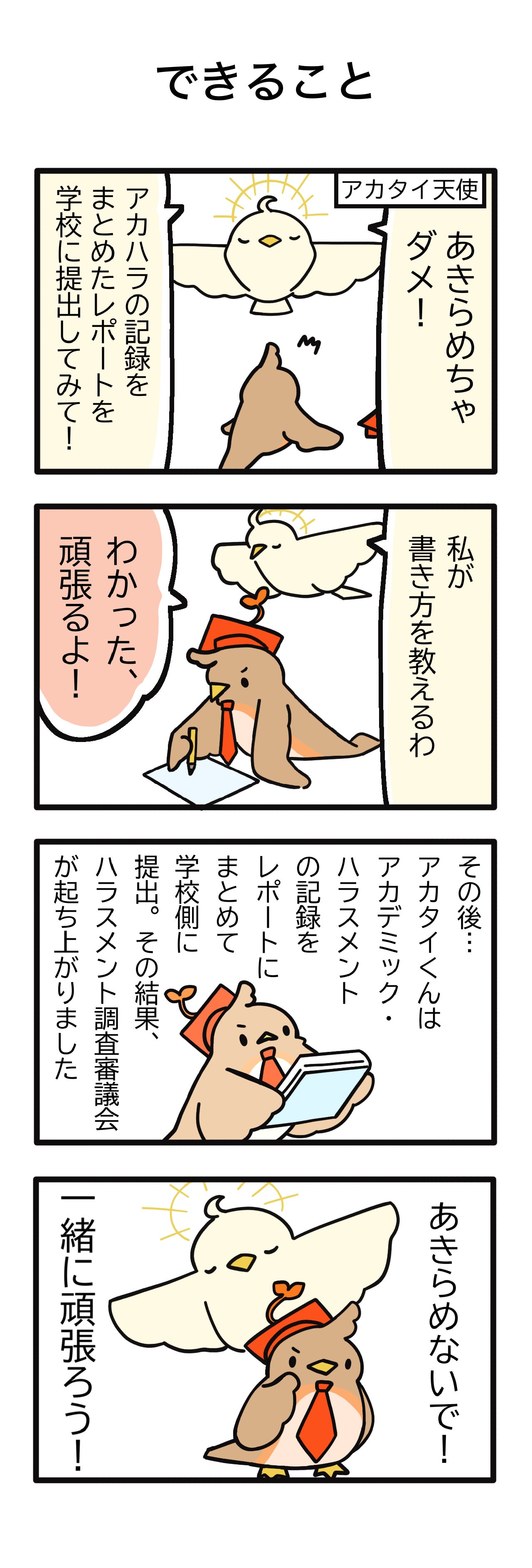 同じような経験をした学生たちが情報を共有し合い、励まし合い、前進するノウハウを社会に還元することで、新しい解決の道を共に拓いていきたい。アカハラのない健全な学習環境を守りたい!