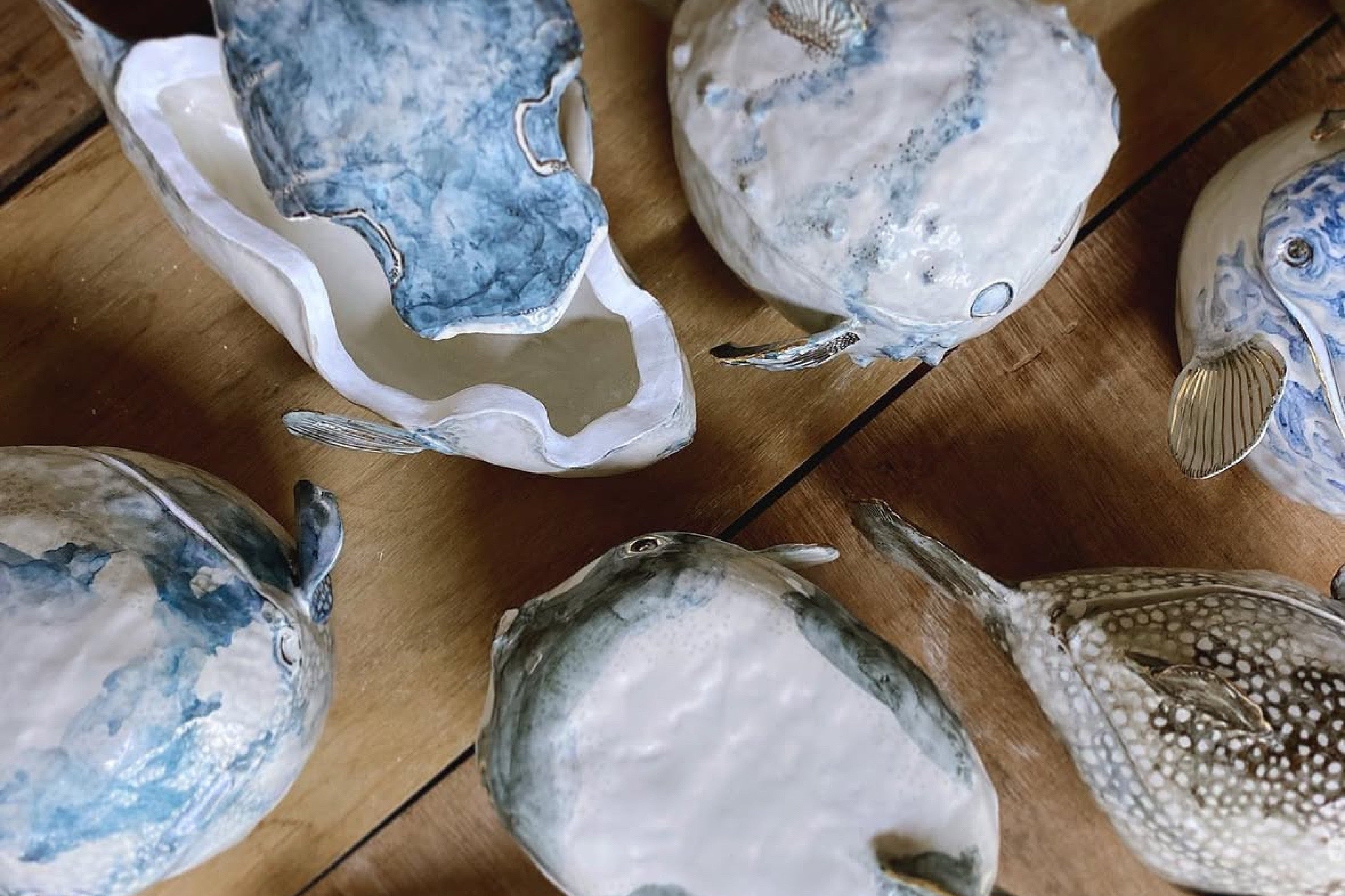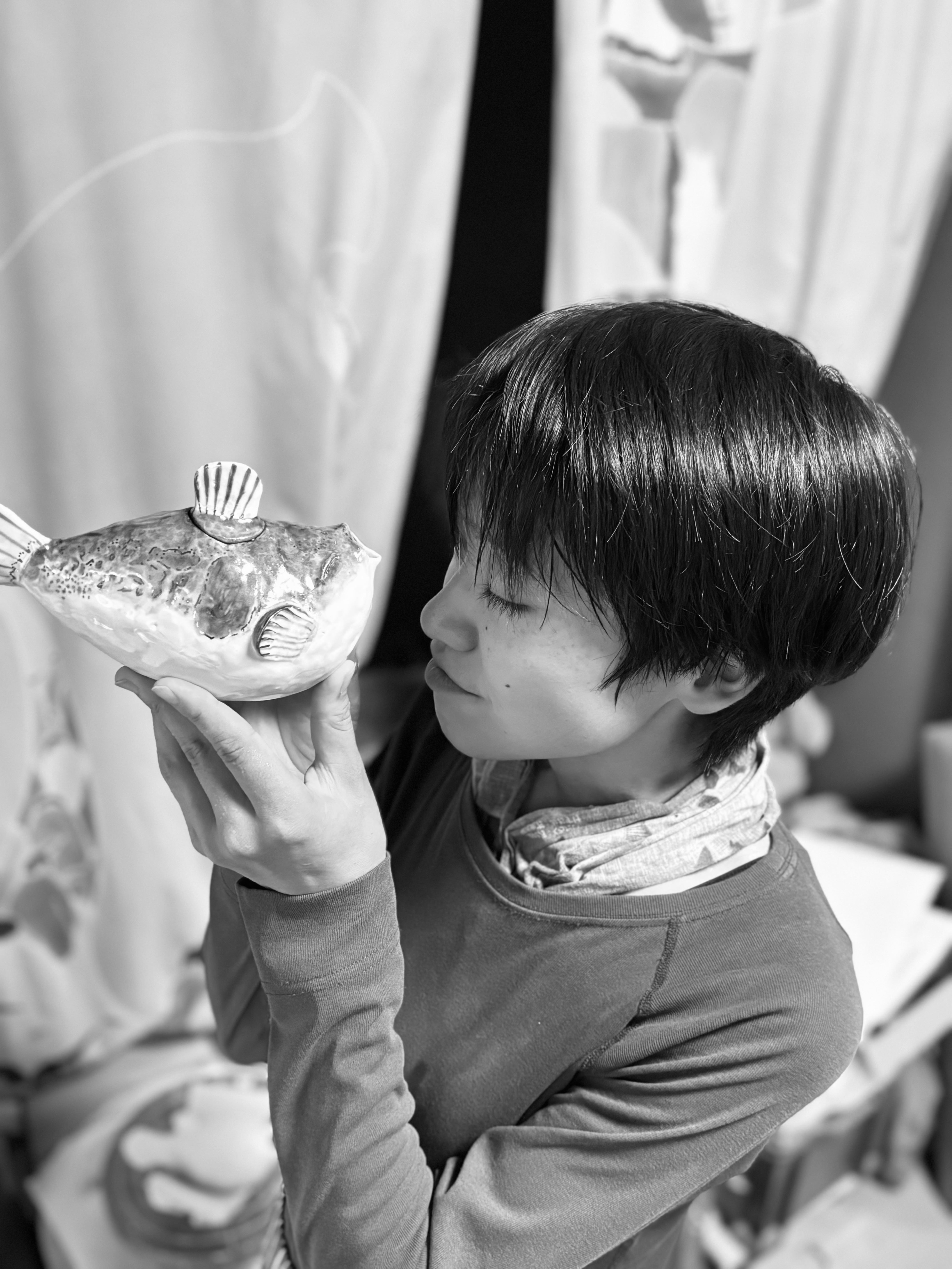 「人に癒しを与える作品を作りたい。」その思いから生まれたのがふぐをモチーフにした作品でした。大学卒業製作、私の作品にたくさんの方から嬉しい反応をいただけたことが私を作品作りに向き合わせてくれました。