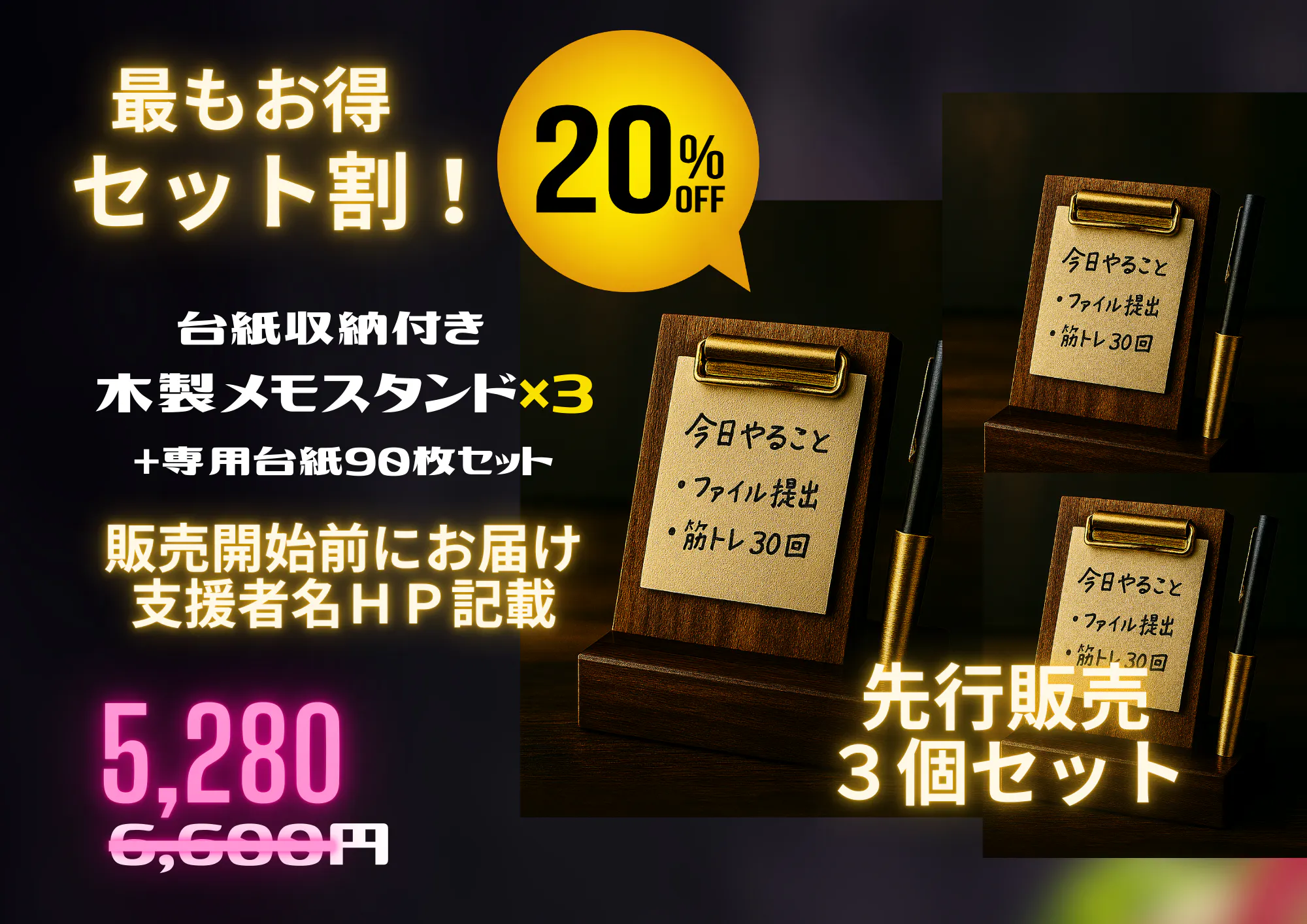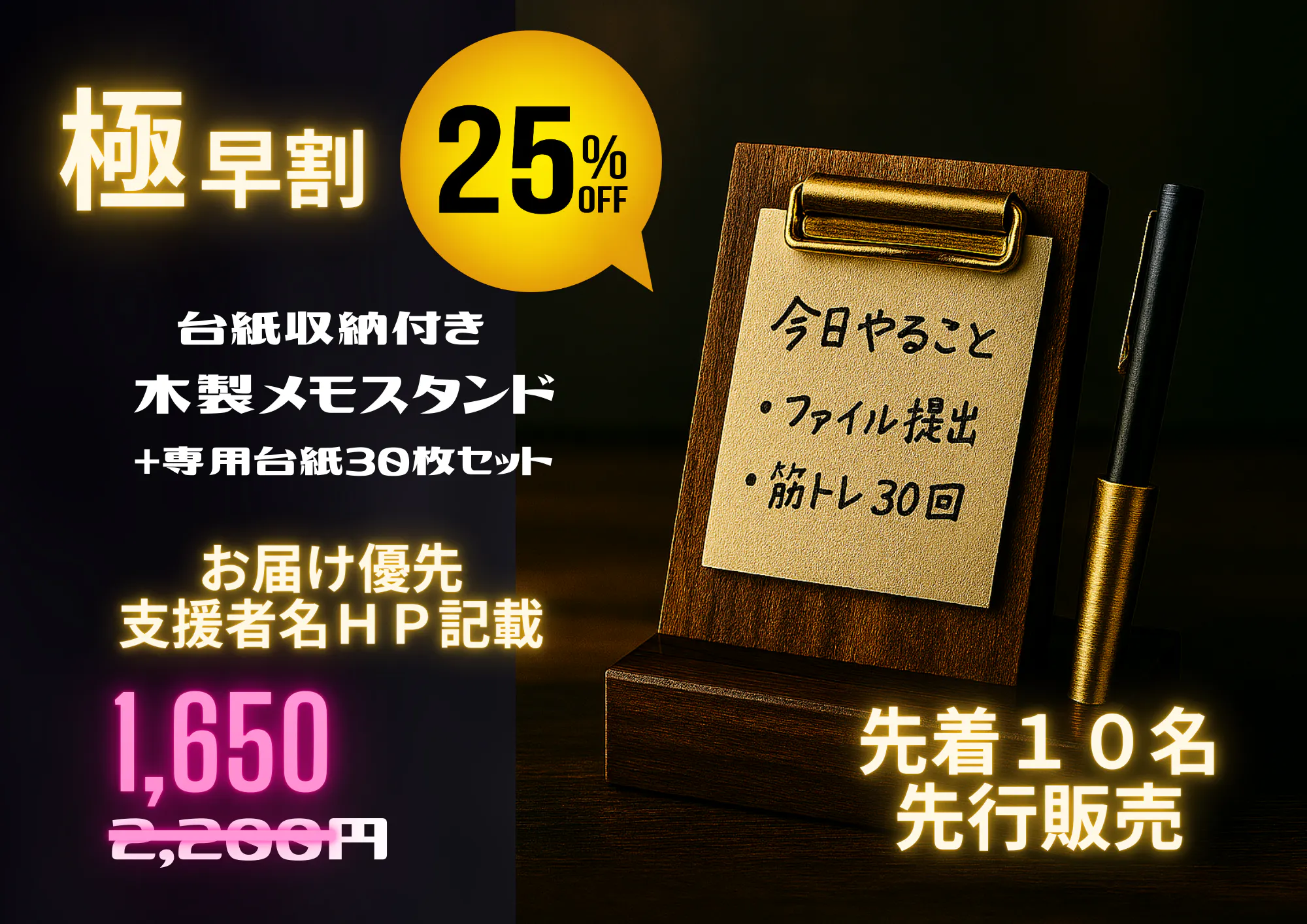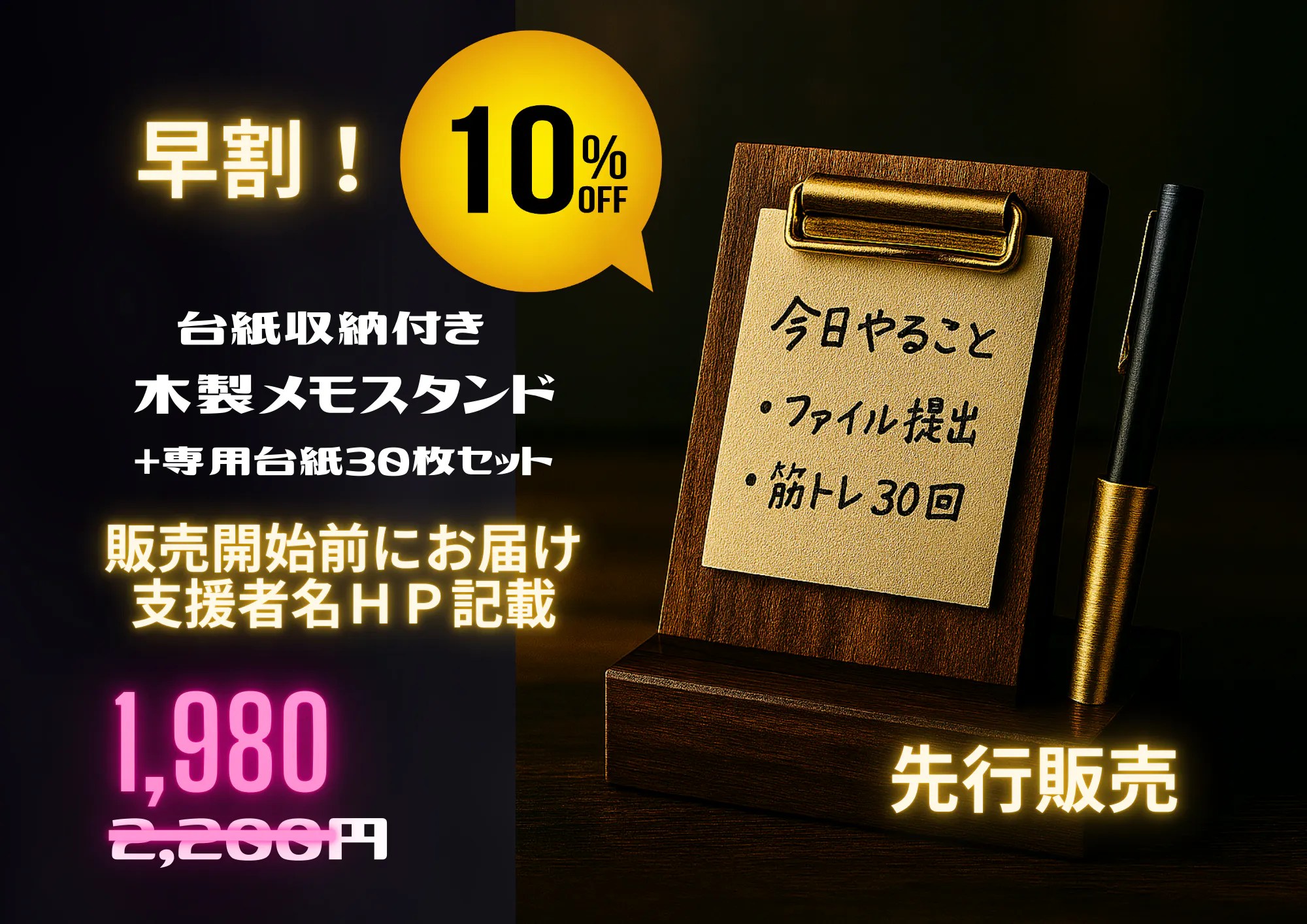 2025/10/21 09:27ご支援いただいた方へ。この度は、CAMPFIREにて、YourDeskの商品を早々からご支援いただき、誠にありがとうございます。企画者の私自身、これが初めてのプロジェクトになりますが、早期からご支援いただけたことが、本当に日々の制作の励みになっております。現在、より高い品質でお届けするため、真鍮パーツや木材の仕上げ工程を一つひとつ見直し、改良を重ねております。その結果、リターンの「木製メモスタンド」の発送予定は【2026年3月頃】となりました。お待たせしてしまうことを心よりお詫び申し上げます。しかしながら、お客様のデスクに長く寄り添う“本当に満足できる一品”に仕上げるための時間だと考え、最後まで妥協せずに製作を進めております。完成した商品をお手元にお届けできるその日を、私自身も心から楽しみにしています。どうかもう少しだけ、あたたかく見守っていただけますと幸いです。なお、早期からご支援いただいたお客様のお名前を、感謝の気持ちを込めてWebサイトに掲載しています。よければ、YourDeskのページも覗いてみてくださいね。 表記名等変更等ご要望ございましたらいつでもご連絡ください。当社webサイト:https://yourdesk.base.shopこれからは、商品制作の進捗や新商品の情報を、Instagramにて発信してまいります。最終的には、ご支援いただいた皆さまご自身が“自分だけのデスク空間”を創り上げられるような商品を数多く生み出し、「選ぶ楽しさ」をお届けしていきたいと考えております。ぜひ、今後の歩みをInstagramでも見守っていただけますと幸いです。 当社インスタグラム:@yourdesk_official もっと見る