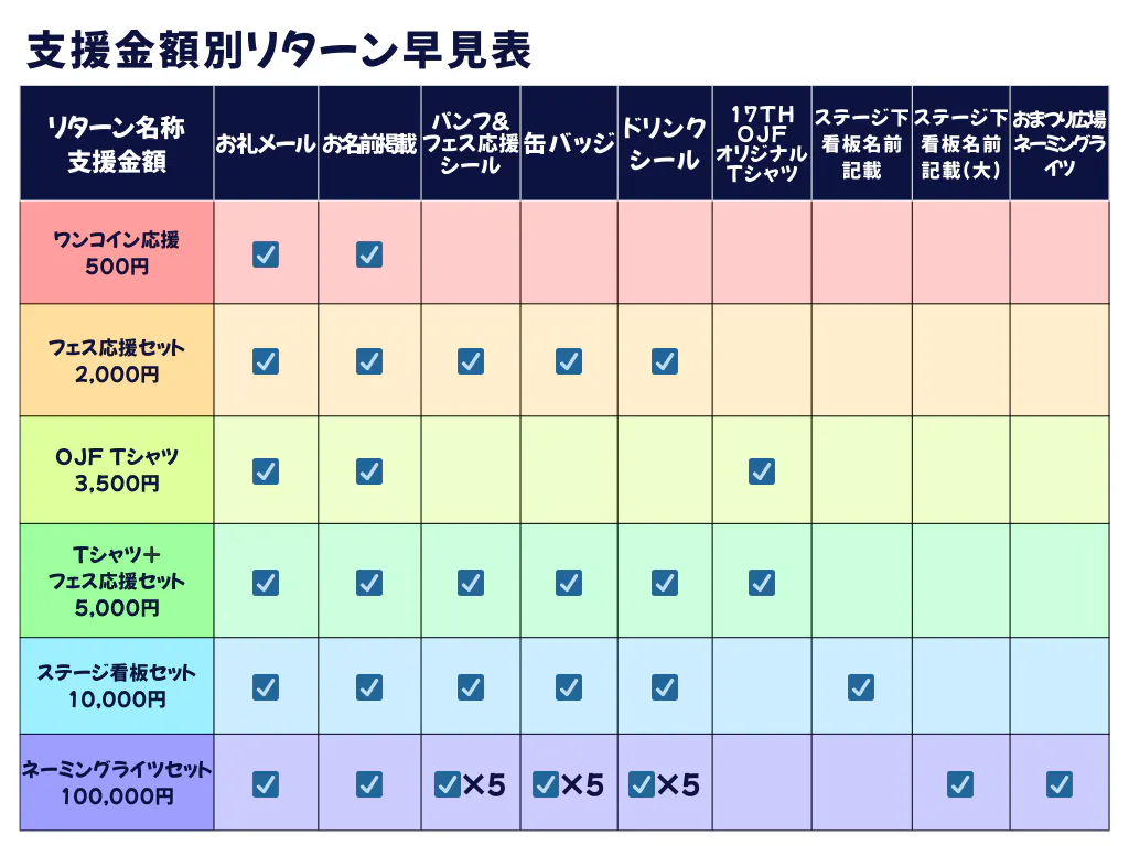 またメインステージのネーミングライツやステージ下の看板として、お気持ちをカタチにしてお返しするリターンや、ちょっとだけなら協力してもいいよという方に、ワンコインから支援いただけるメニューもご用意しております。