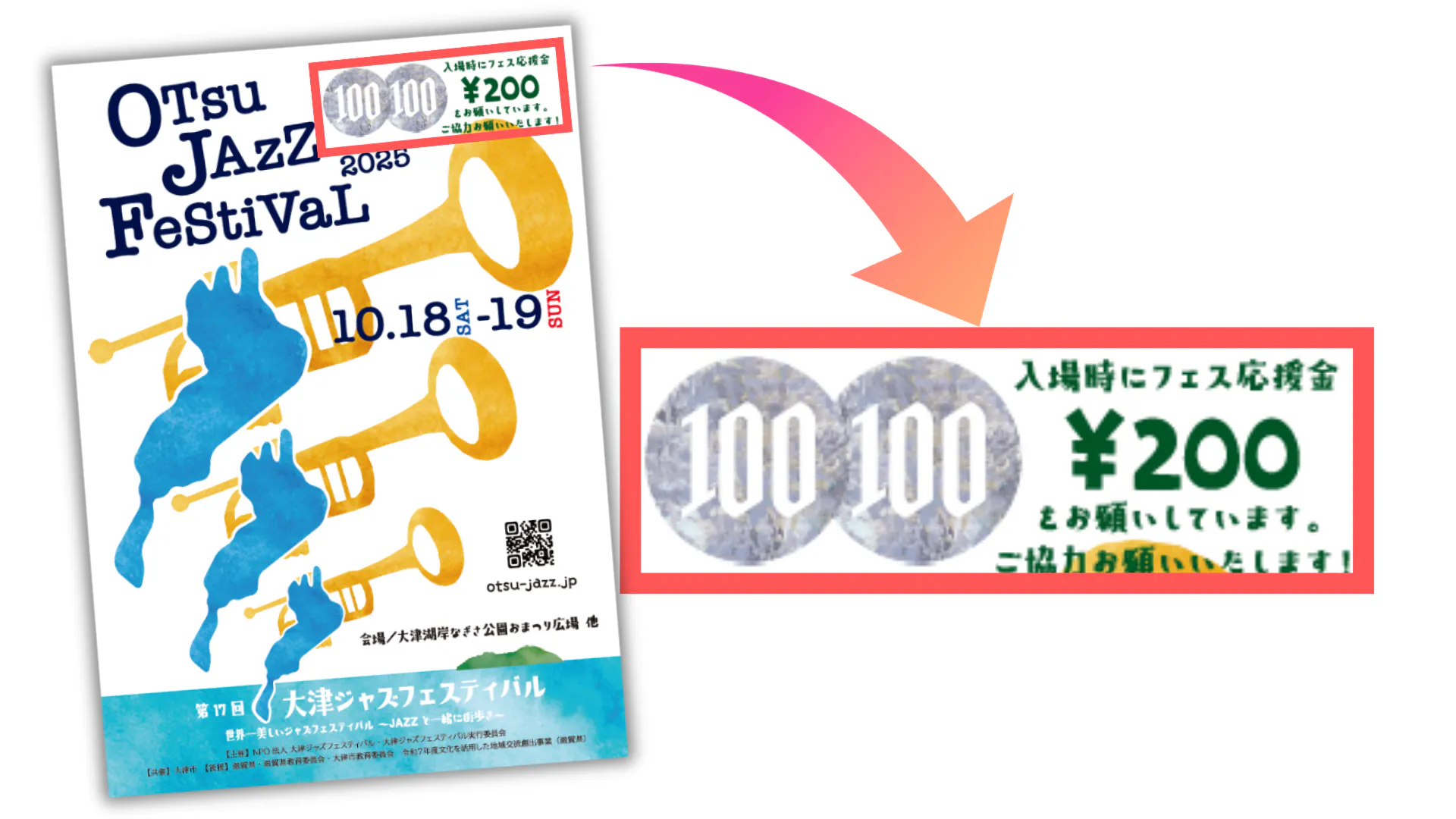 ところが「フェス応援金」導入後も残念ながら赤字脱却は図れておりません。かといってこれ以上イベント経費を削減しては、大津ジャズフェスティバルの魅力が失われてしまう…。そこで大変申し訳ないのですが今回「フェス応援金」を増額(100円→200円)させていただくことにしました。