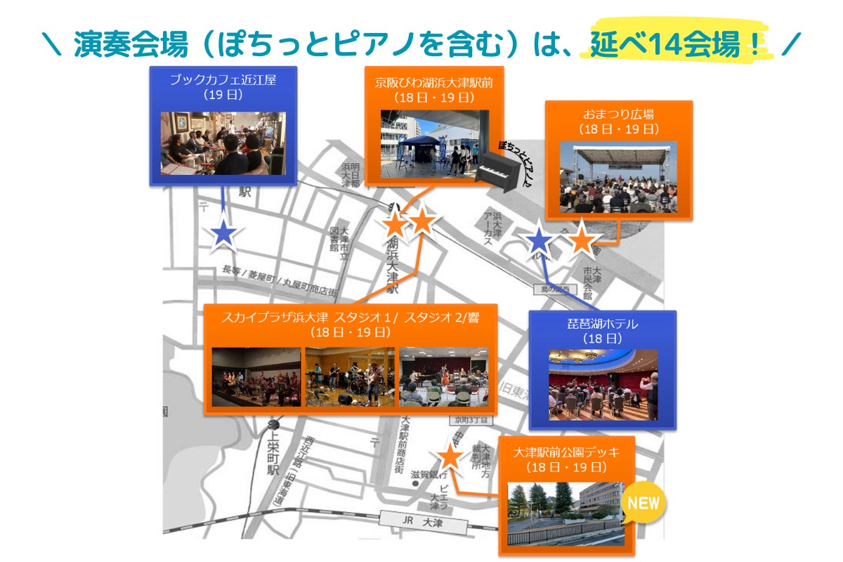 10月18日(土)・19日(日)の2日間に延べ14の会場(ぽちっとピアノを含む)で、プロ・アマ合わせて約80のステージが繰り広げられますが、そのステージは大津市の公共施設はもとより、地元企業・店舗のご協力により実現しています。