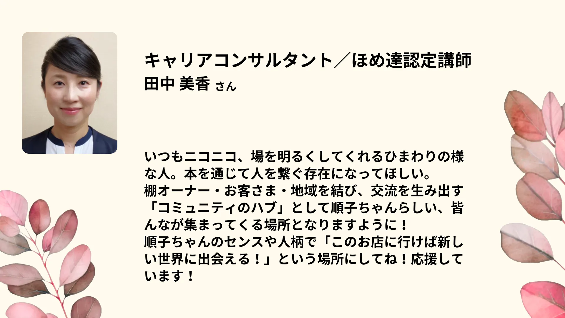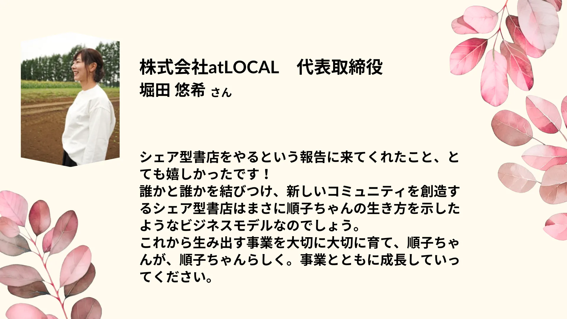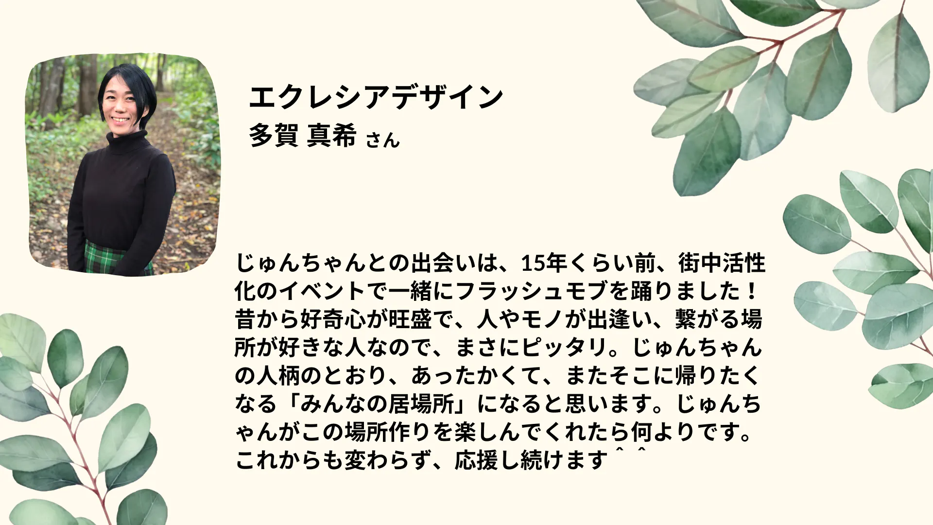私は何がしたいのか、立ち止まって考えてみると、その答えは単純でした。「今、目の前にいる人を笑顔にすれば良い」ただそれだけ、でもまずはその小さな一歩から。目の前の人が笑えるような場所を創り上げ、そこから次々と笑顔が繋がっていくことを目指します!