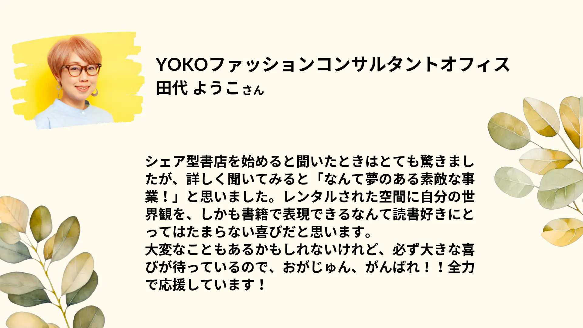 2026/03/25 09:00こんにちは!『よはくの本やさん』の小川順子です。グランドオープンして3か月が経ちました。おかげさまで、少しずつ棚オーナーも増え、現在75棚のお店がオープンしています!棚オーナーの来店が多かったオープン当初と比べて、最近は一般のお客さまに多く来店いただくようになりました。棚オーナー同士、棚オーナーとお客さまの交流も生まれ、『よはくの本やさん』がコミュニティの場となっているのも嬉しく思います。棚オーナーの想いを知れば知るほど、もっと『よはくの本やさん』を多くの方に知っていただき、棚オーナーの魅力をみなさまにお伝えしていきたい!と強く思うようになりました。そこで!『よはくの本やさん』のYouTubeを始めました!!初めてのYouTube撮影で素人感満載ですが、出来ることから少しずつ挑戦していきたいと思います。ぜひ、YouTubeのチャンネル登録にもご協力ください!YouTube動画↓https://www.youtube.com/@yohaku_no_honyaこれからもどうぞ応援よろしくお願いします!よはくの本やさん店主 小川順子 もっと見る2025年の営業が終了しました