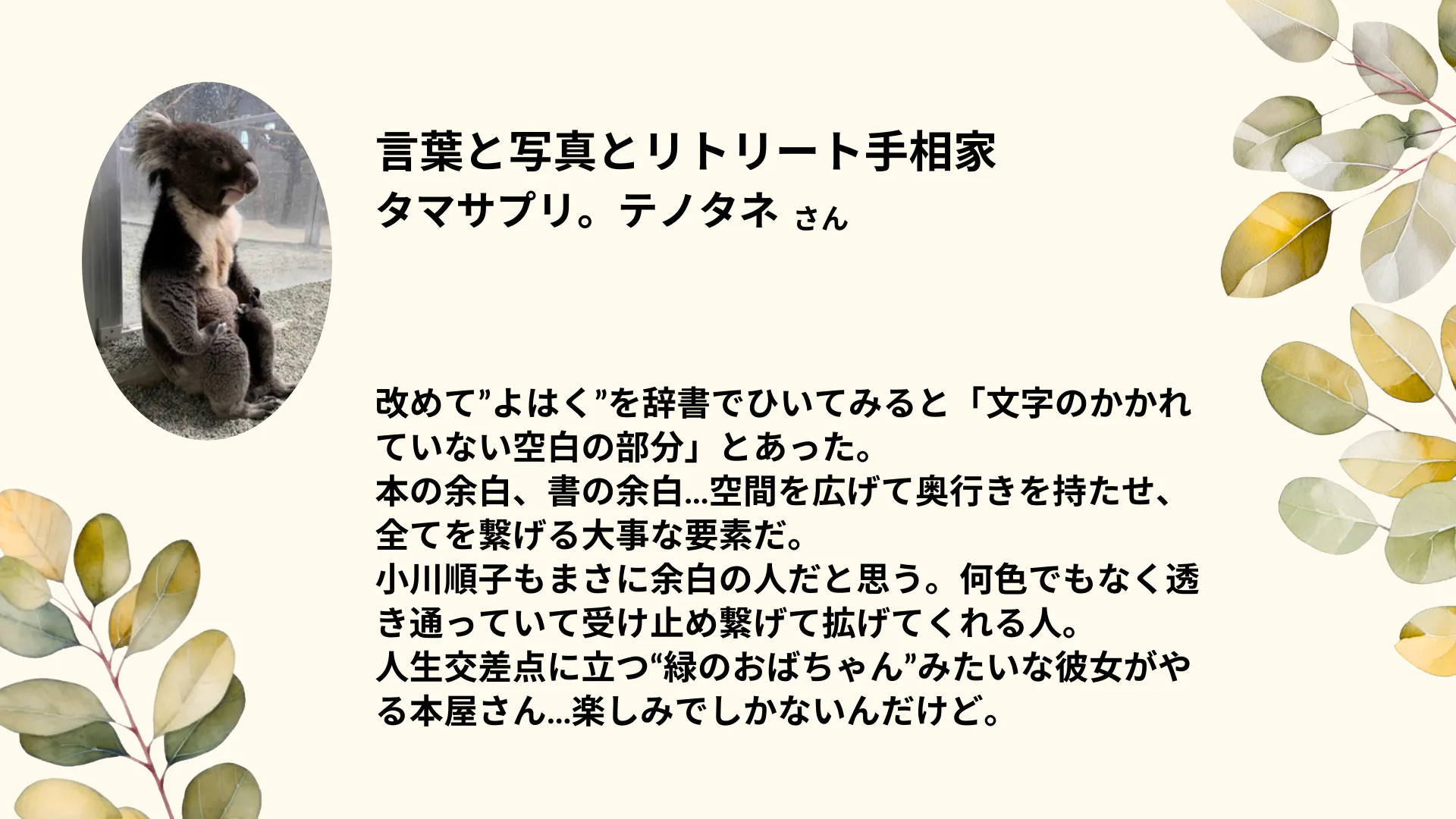 なぜ『よはくの本やさん』という名前なのかというと、わたしには日々の仕事や人間関係に忙しく追われ、こころもからだも疲れてしまった時期がありました。一杯いっぱいで何もしていないのに涙が出てくる。こんな経験をした人はわたしだけではないはずです。そんな時、「あえて何もしない」という時間を作り、少しずつこころに余白が生まれてきました。その余白は大きくなったり、小さくなったりを繰り返し、人の温もりや自然の美しさ、人が創りだす芸術、そしてそれらを取り巻くさまざまな物語でこころが満たされていきました。