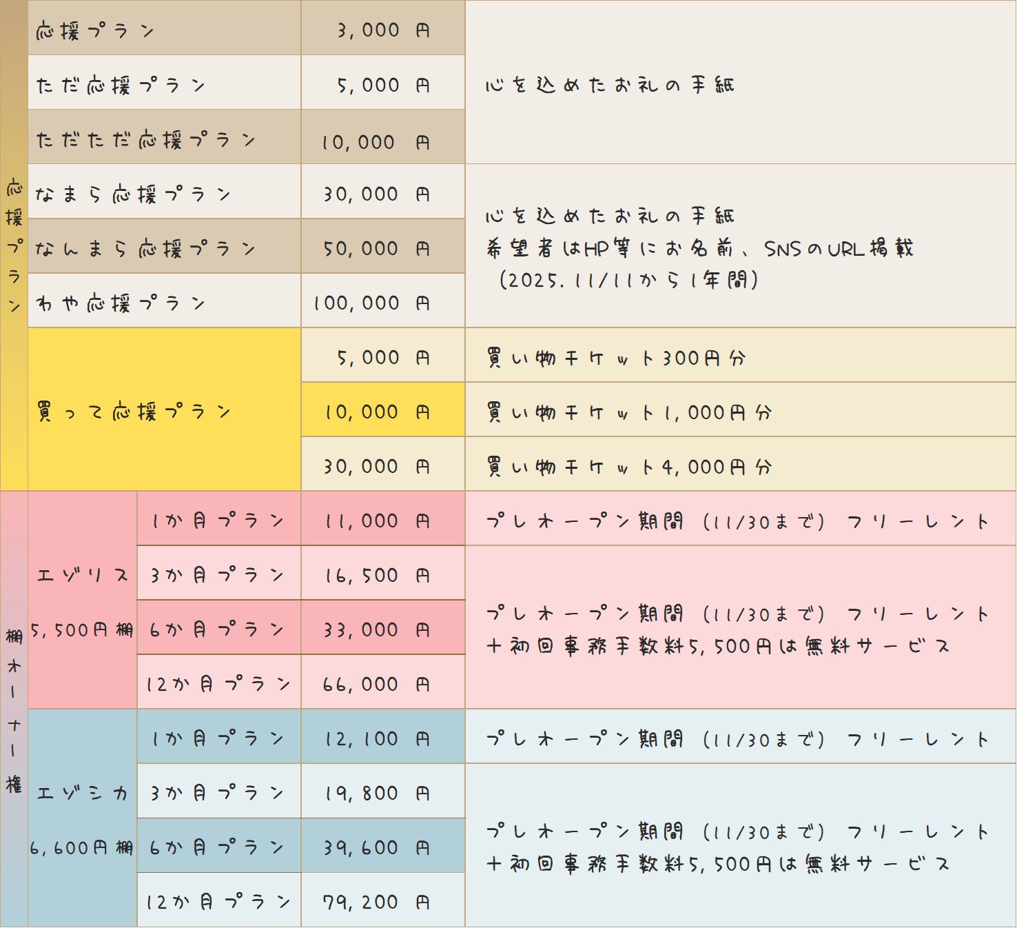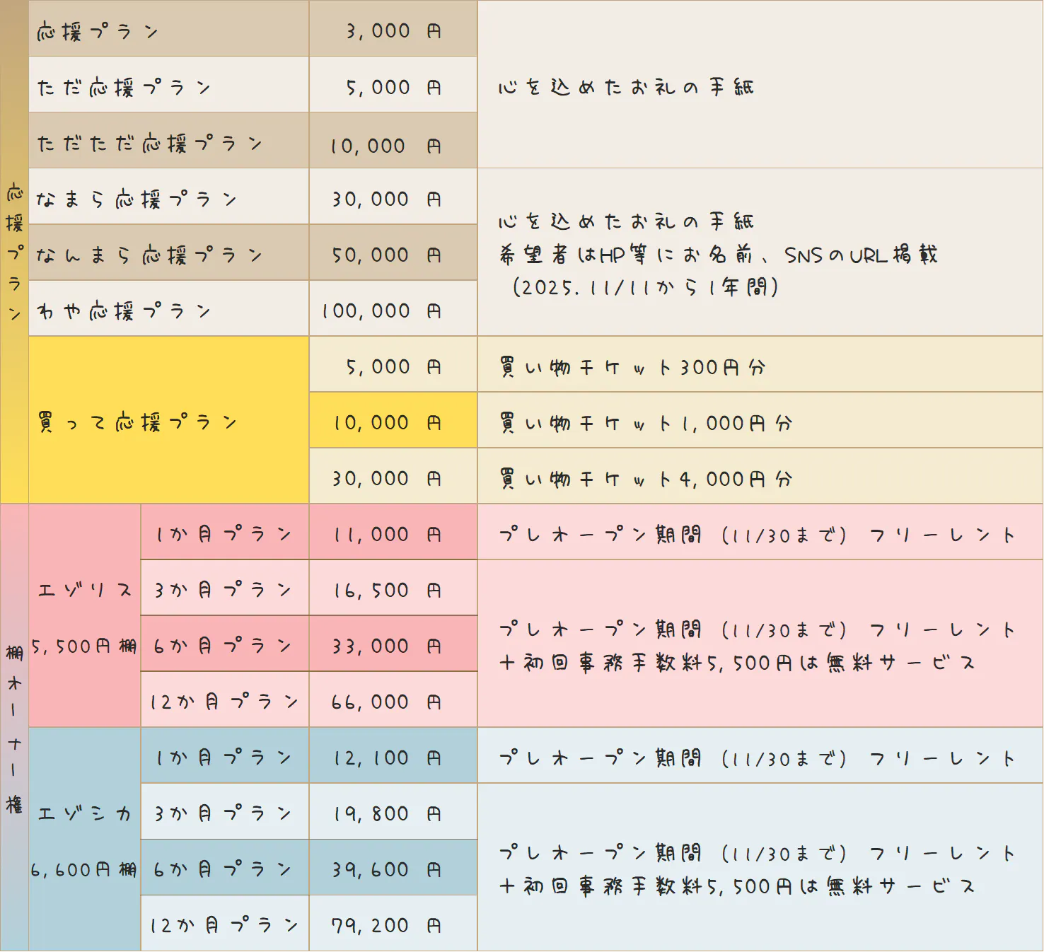 ※クラウドファンディングにて棚オーナーをお申込みいただいた方は、11/11~11/30までの棚代はいただきません。「〇か月プラン」の月数は2025年12月からの月数になります。