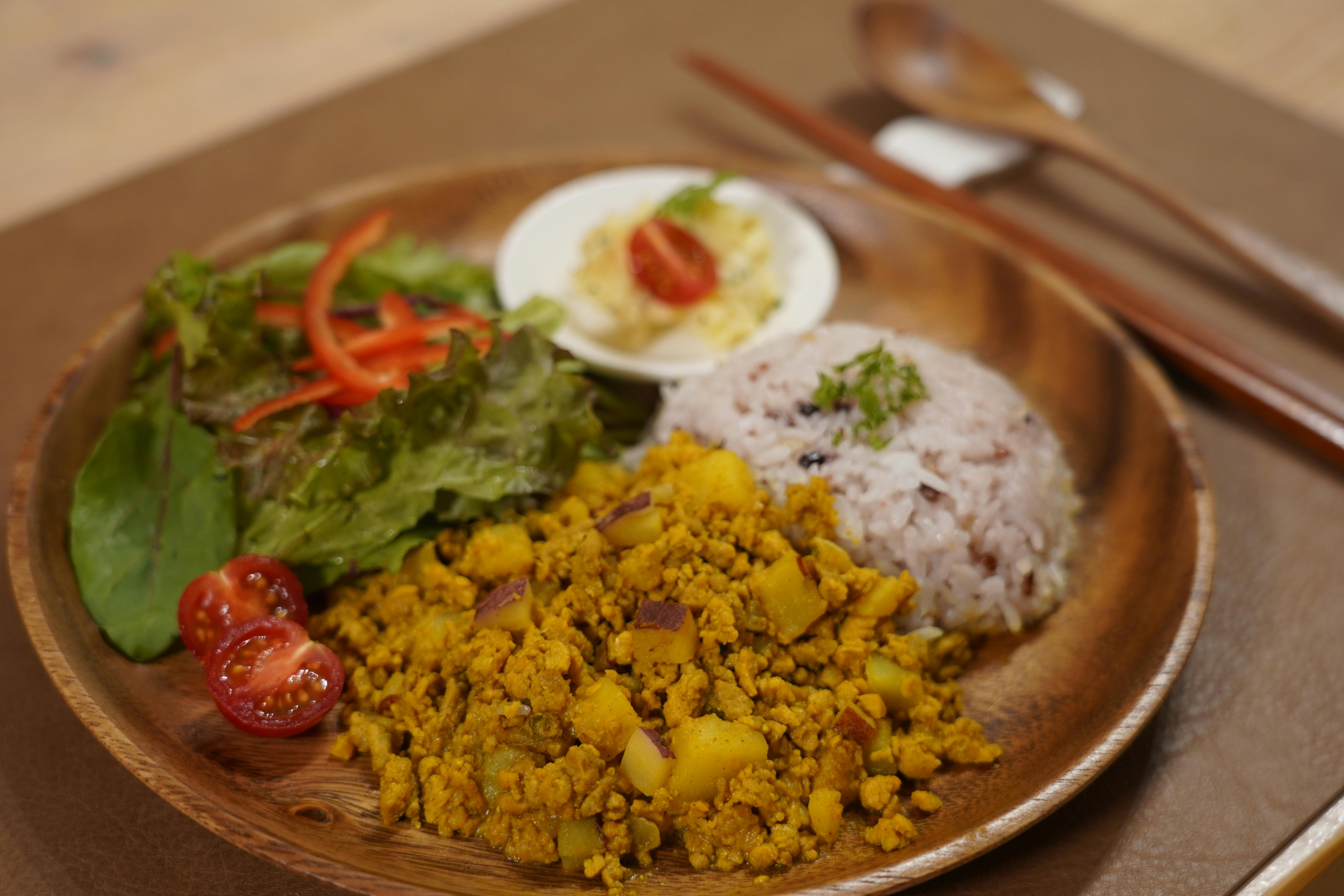 メインメニューは「かめ焼き芋」と「美芋キーマカレー(豚ミンチ×大豆ミートのハイブリッドカレー)」。