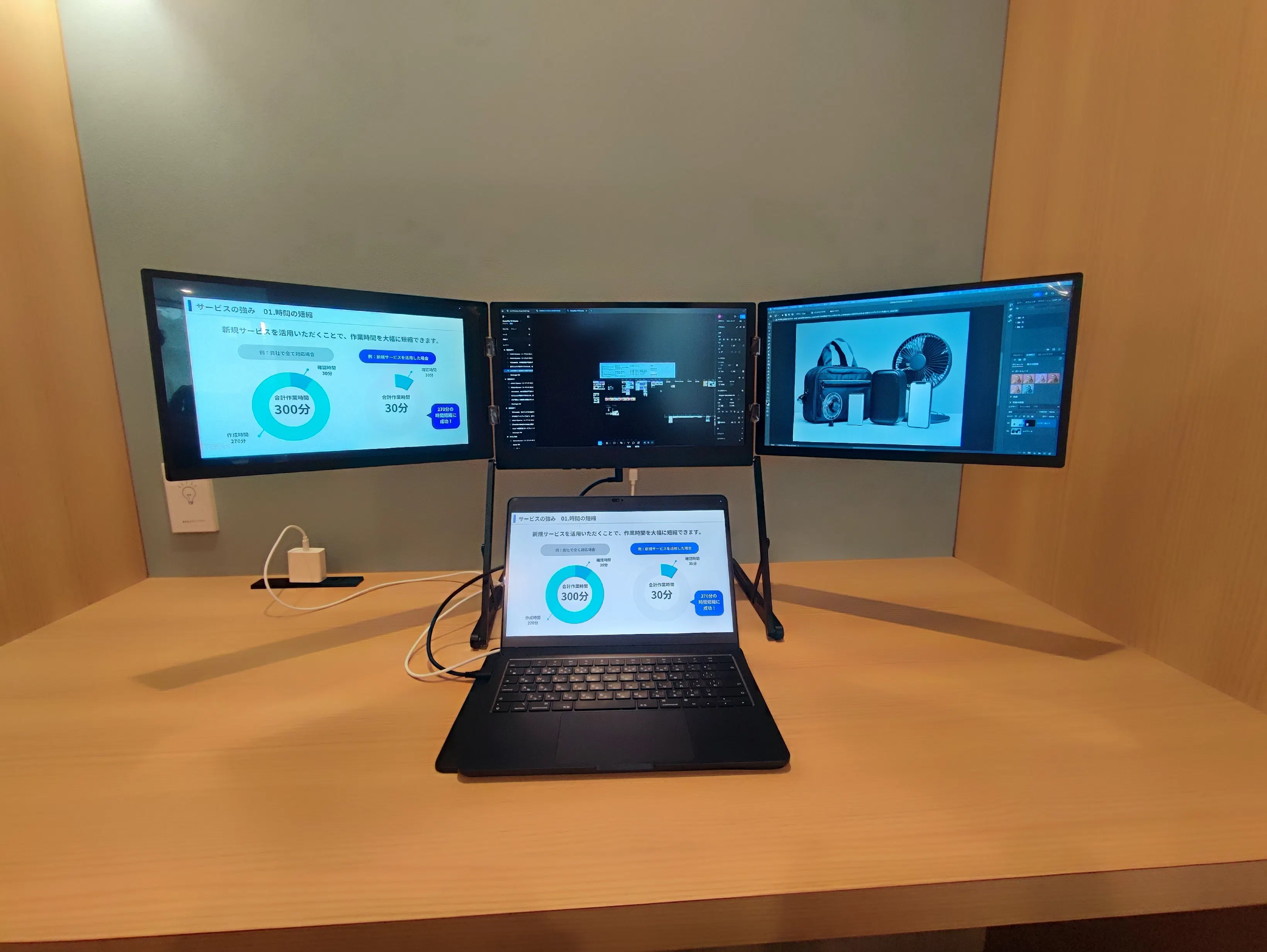 「出先でもデュアルモニターが欲しい…」そんな思いから、私はこのプロジェクトを始める前からTriCreate 3画面モニターを愛用してきました。