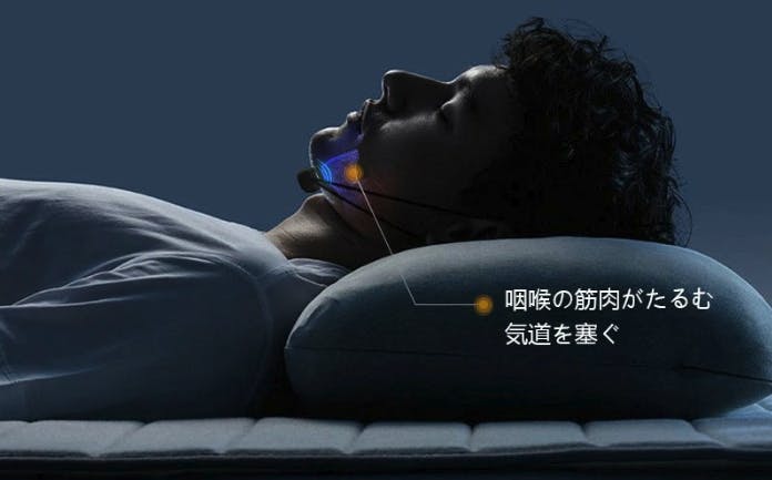 このデバイスは、首元に装着するだけで就寝時の呼吸をサポートする小型デバイスです。