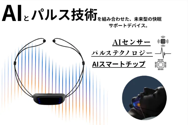 AI搭載のスマートチップと高精度センサーが呼吸リズムを検知し、必要なタイミングで微弱なパルスを発生。喉やあごの筋肉をやさしく刺激し、自然なリズムを促します。