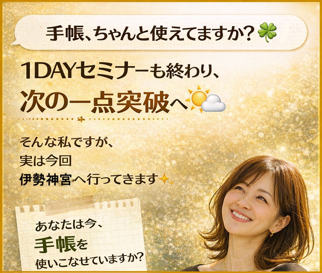 2026/02/21 09:00いやー1DAYセミナーも終わり、今度は次の一点突破へ!!そんな私ですが、実は今回伊勢神宮へ行ってきます☆2月は諦めていたのに、あれやこれやで結局行ける流れに。これも不思議なご縁。一度参拝してから、なぜか毎年行けているんですよね。この流れを作ってくれているのも、実は「手帳」なんです。さて。あなたは今、手帳を使いこなせていますか?不安はありませんか?先日こんなお声が。「私、フィーリング手帳向いてないかも…」聞いてみました。1日いくつ書けていますか?答えは10〜30個(笑)いやいや、十分です(笑)1日1個で◎つけていいんです。10個なら◎10個ですよ?それでいいんです。どこか1か所書けたら自分に丸をつける。まずはそこから。そしていつか書かないと落ち着かない。そんな日常になれば最高です。わからないことはいつでもお気軽にご連絡くださいませ☆1番連絡が取りやすいのはオプチャです☆▼時間管理術オープンチャットhttps://line.me/ti/g2/_rMgbJWnl8gF2-Qa_9HkwyhdV0MKNddp3eUdcQ?utm_source=invitation&utm_medium=link_copy&utm_campaign=default2番目は、フェイスブックと公式ライン(1週間ほどでお返事します)▼Facebookhttps://www.facebook.com/chieko.bochoumer▼公式LINEhttps://lin.ee/VMtdgb9▼ライブはこちらhttps://youtu.be/TXDUgCYctdA一緒に手帳を育てましょう!ちえぞう もっと見る