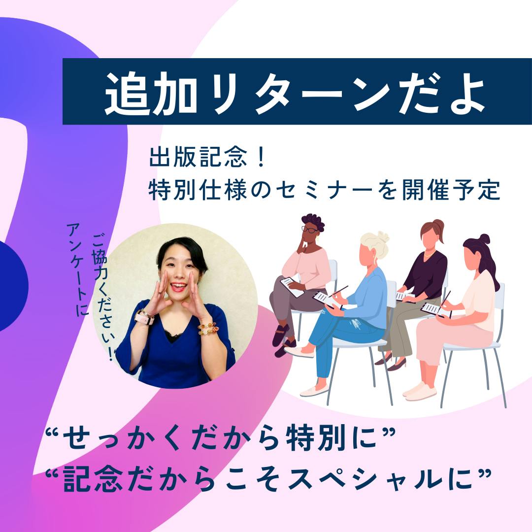 今回のあとから支援には、新たに“東京セミナー参加リターン”も追加しています☆今回は、出版記念ということもあり、特別仕様のセミナーを開催する予定です。内容は、これまでの集大成となる「特別版」。そして今回は、Zoom参加も含めてすべて有料とさせていただきます。だからこそ、“せっかくだから特別に”“記念だからこそスペシャルに”そんな気持ちで、今までにないセミナーをつくっていきます。そのために、ぜひ皆さまのお力をお借りしたく、セミナータイトルのアンケートにご協力いただけると嬉しいです。こちらからご回答ください。https://forms.gle/VpqnXH9tAbWKmd6s8あなたの一票が、今回の記念セミナーを形づくる大きな力になります。ぜひお気軽にご参加ください☆
