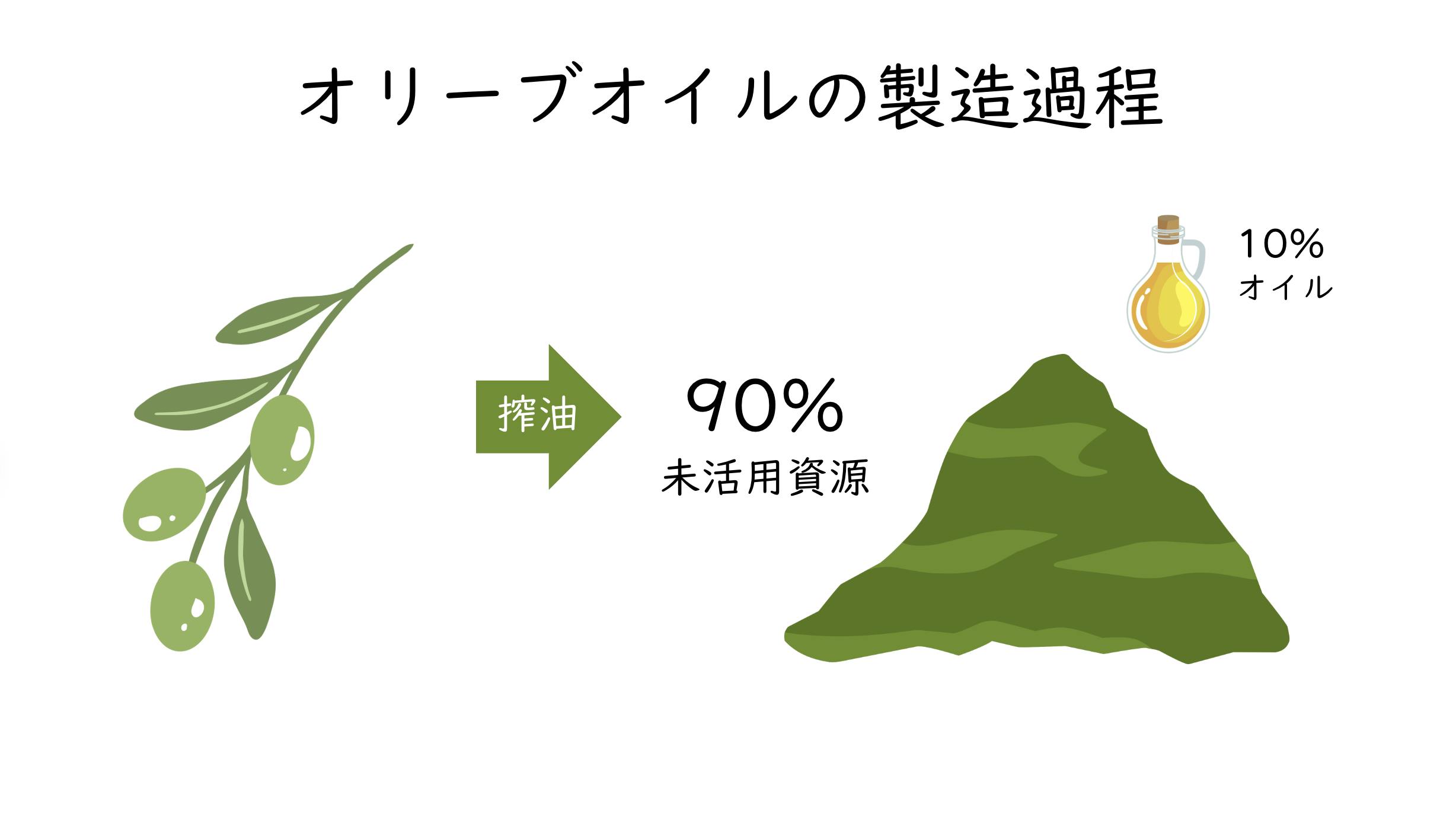 実は、オリーブオイルを絞るときに出る 9割の資源 が活用されていない現状があります。
