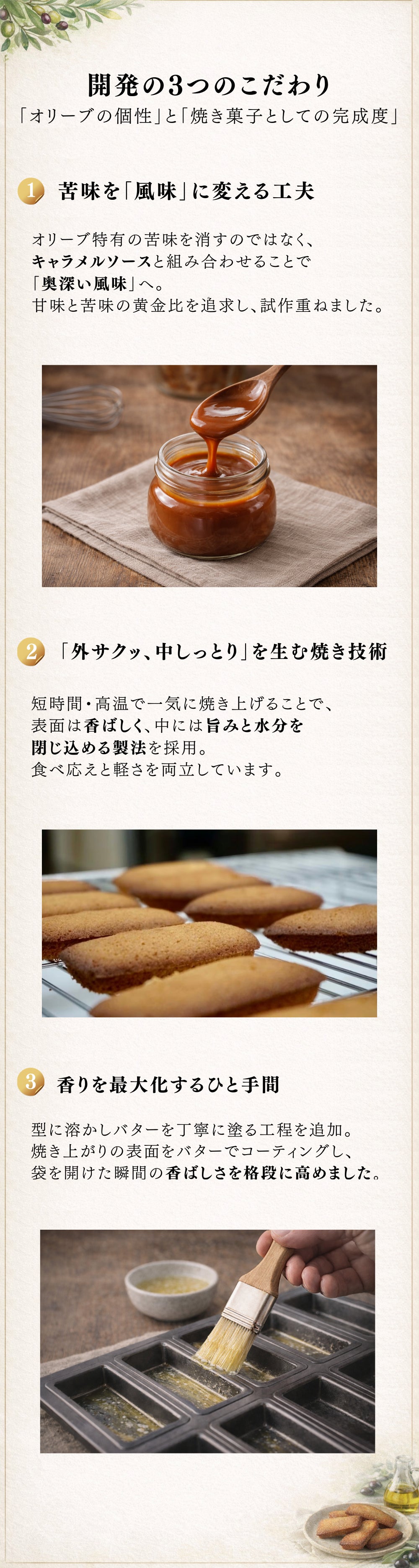 こうした声を真摯に受け止め、フィナンシェの型の変更やオリーブピューレとキャラメルソースの配合調整など、最後の最後まで改良を重ねて完成したのが、今回お届けするフィナンシェです。