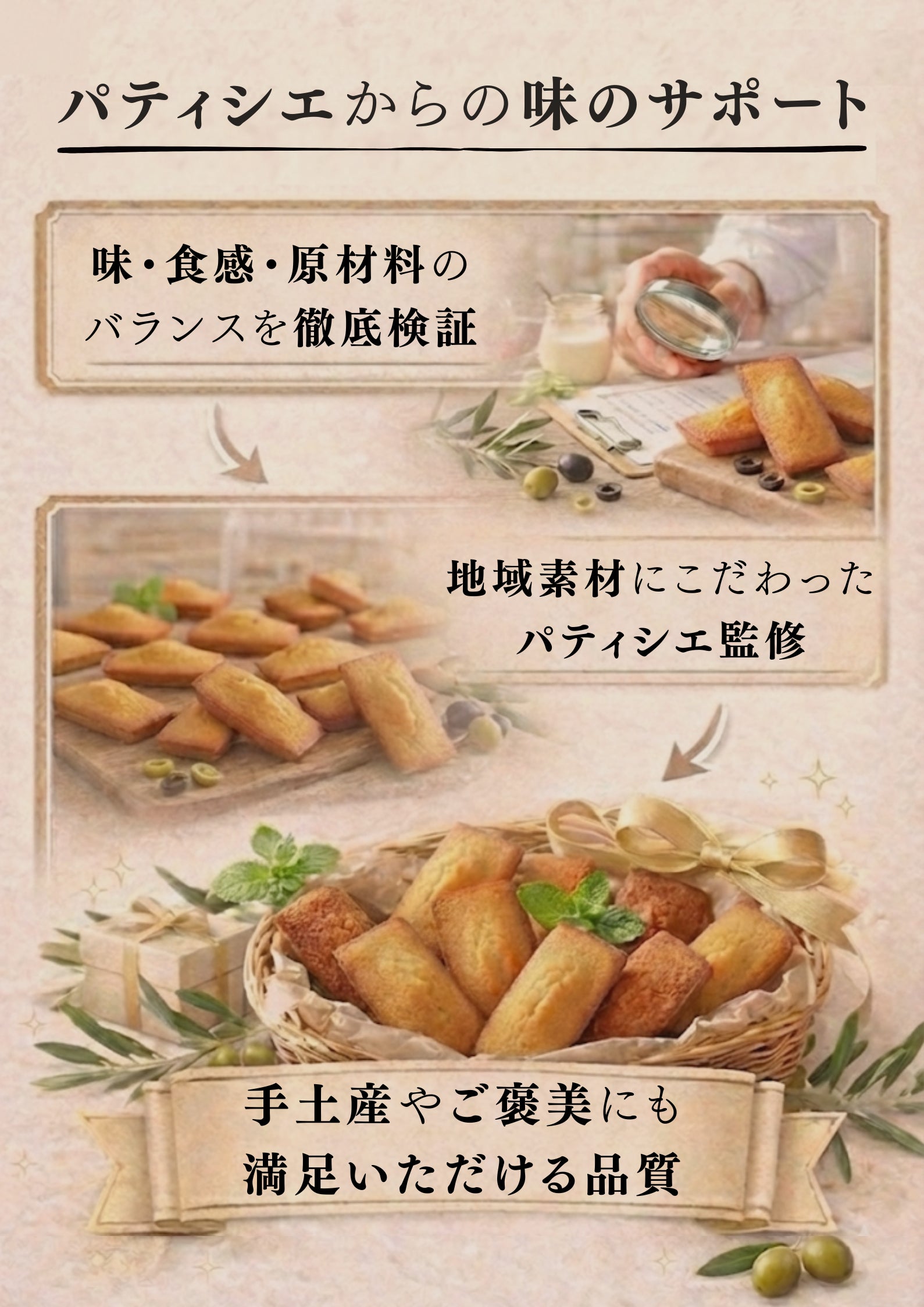 こうした声を真摯に受け止め、フィナンシェの型の変更やオリーブピューレとキャラメルソースの配合調整など、最後の最後まで改良を重ねて完成したのが、今回お届けするフィナンシェです。