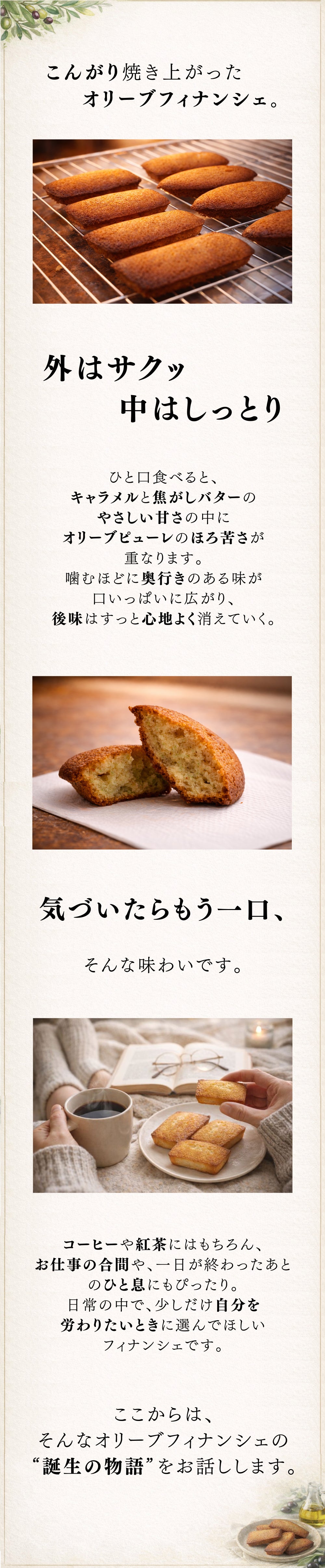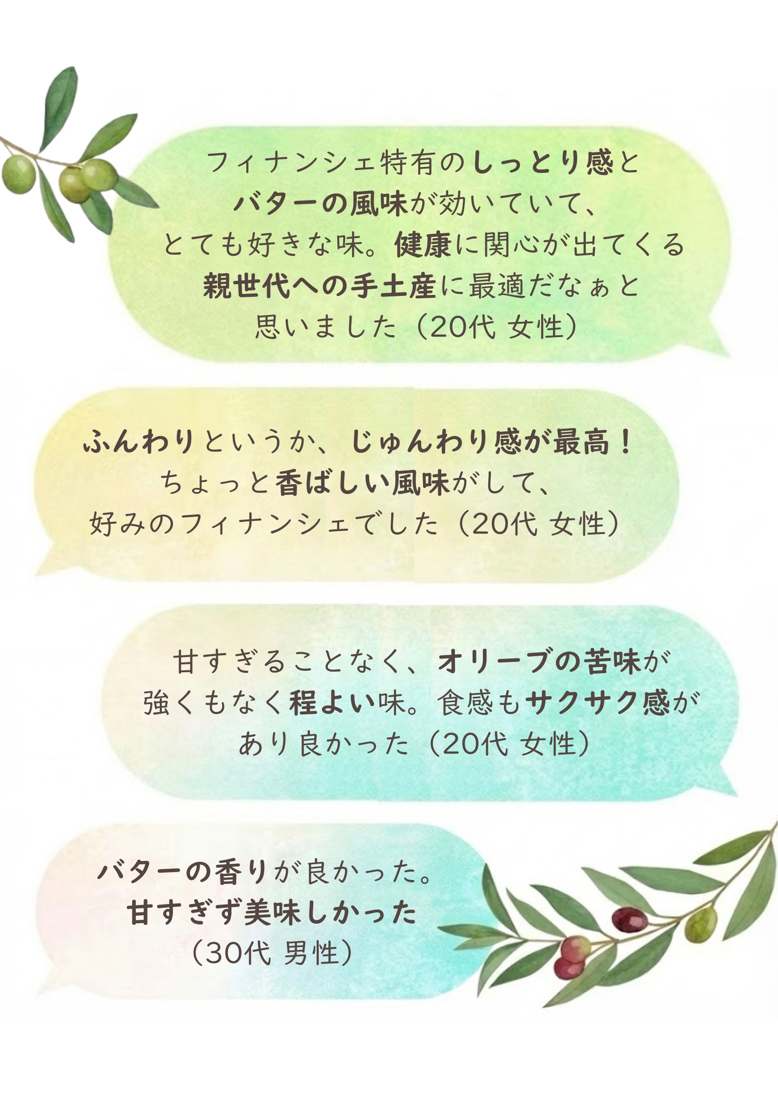 私たちのこだわりと、皆さんの声が詰まったオリーブフィナンシェ。