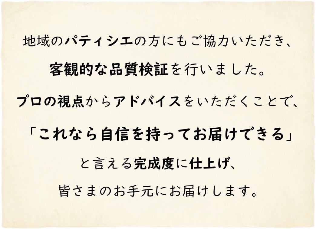 単なる「社会貢献商品」の枠を超え、スイーツとして純粋に選ばれる品質を目指し、何度も試作と検証を重ねました。