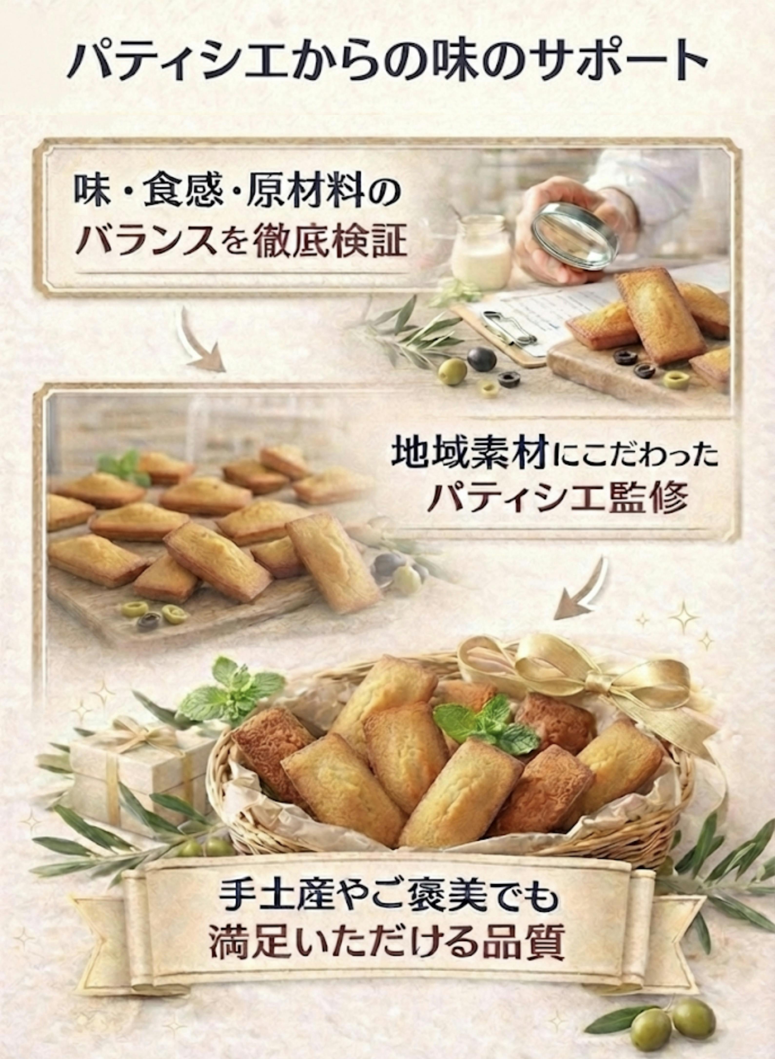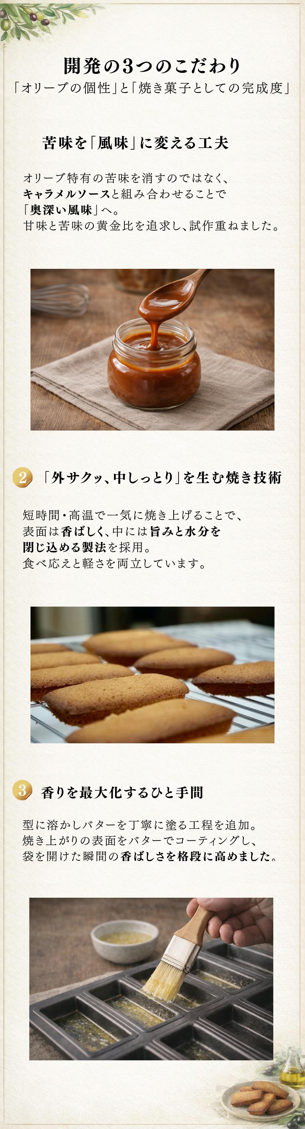 こうした声を真摯に受け止め、フィナンシェの型の変更やオリーブピューレとキャラメルソースの配合調整など、最後の最後まで改良を重ねて完成したのが、今回お届けするフィナンシェです。
