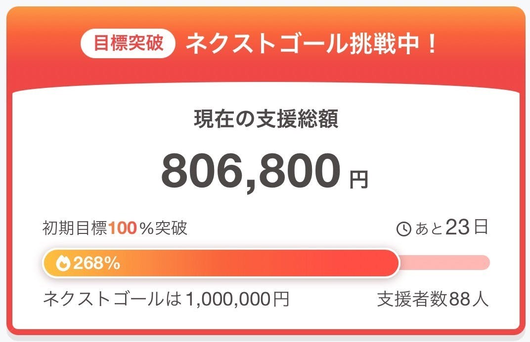みなさまの温かいご支援のおかげで、目標金額の260%を超え、80万円を突破することができました!