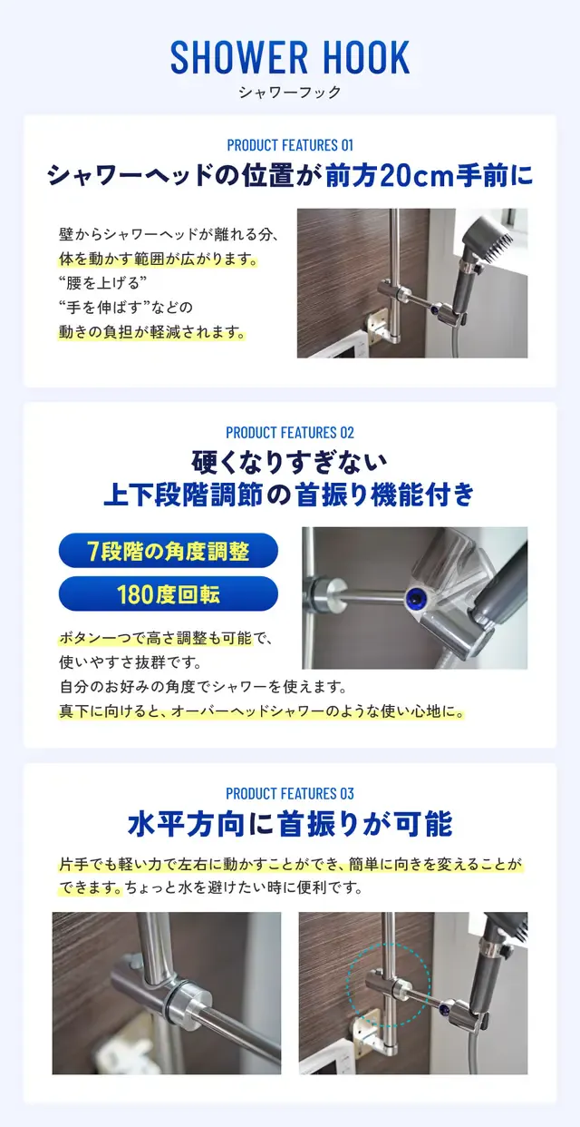 - ・フレキシブルな調整:シャワーフックは7段階の角度調整が可能で、さらに高さもボタン一つで変更可能