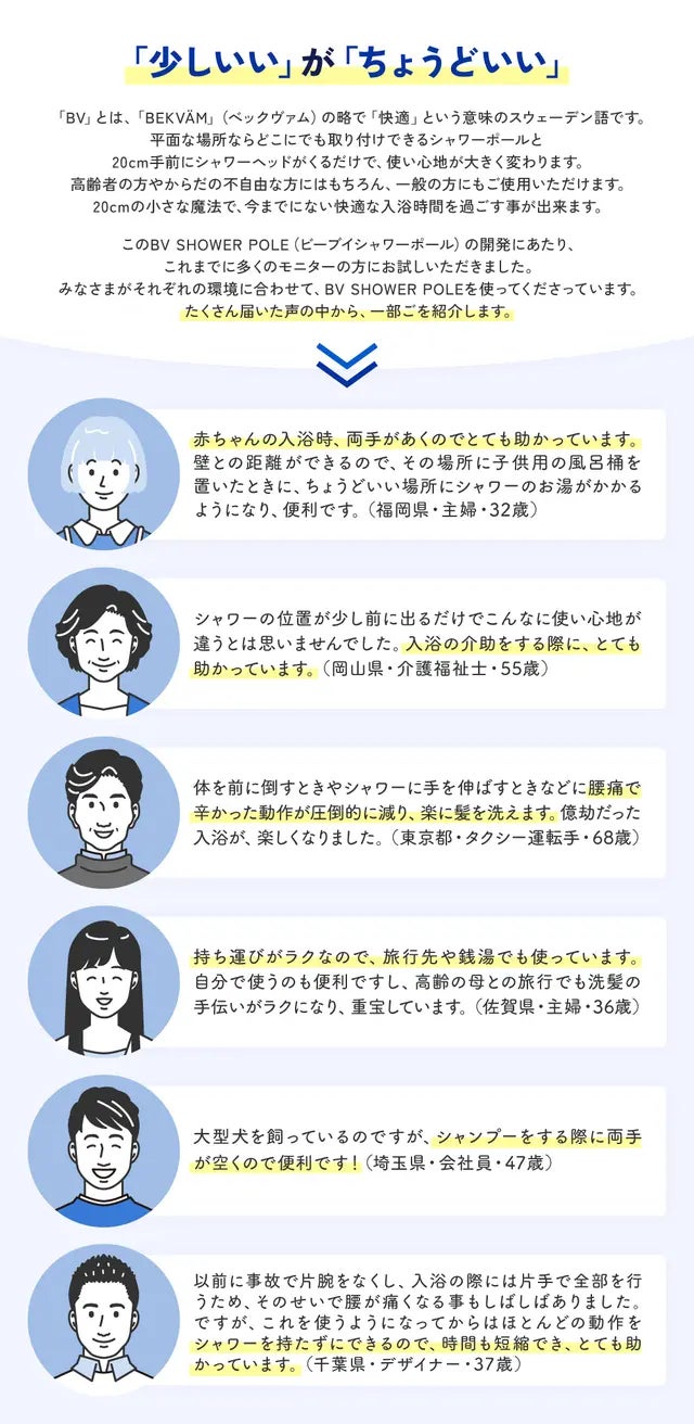 どなたでもBV SHOWER POLEの「20cmの小さな魔法」で、これまでにないリラックスしたバスタイムを実現します。