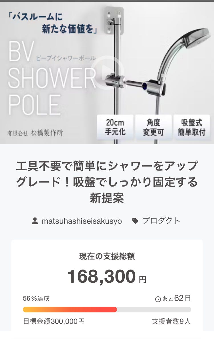2025/12/15 10:39支援者の皆さまBV SHOWER POLE プロジェクトを応援していただき、誠にありがとうございます。本日、クラウドファンディング最終日を迎え、目標金額を達成することができました。皆さまの温かいご支援、応援コメント、一つひとつが大きな力となり、このプロジェクトを最後まで走り切ることができました。心より御礼申し上げます。BV SHOWER POLEは、「工具不要で取り付けできる」「シャワーヘッドが約20cm手前にくる」構造により、高齢者や障がいのある方、介助が必要な方、そして賃貸住宅にお住まいの方でも、誰もが安心して入浴できる環境をつくりたいという想いから開発しました。今回の目標達成は、「この製品が必要とされている」という皆さまからの明確なメッセージだと受け止めています。本日終了にあたり本日が支援いただける最後の一日となります。ご検討中の方がいらっしゃいましたら、ぜひこの機会にご参加いただけましたら幸いです。すでにご支援くださった皆さまも、身近な方へのシェアという形で応援いただけましたら、大変励みになります。今後についてプロジェクト終了後は、・製品の量産・最終調整・吸盤タイプに加えたマグネットタイプの展開・リターン品の製作・発送準備を順次進めてまいります。進捗状況につきましては、引き続き活動報告にてご案内いたします。最後に本日をもって本プロジェクトは終了となりますが、BV SHOWER POLEの取り組みは、ここからが本当のスタートです。この製品が、誰かの「入浴の不安」を減らし、「自分でできた」という小さな自信につながることを、心から願っています。改めまして、最後までご支援・応援いただき、本当にありがとうございました。有限会社 松橋製作所BVシャワー スタッフ一同 もっと見る