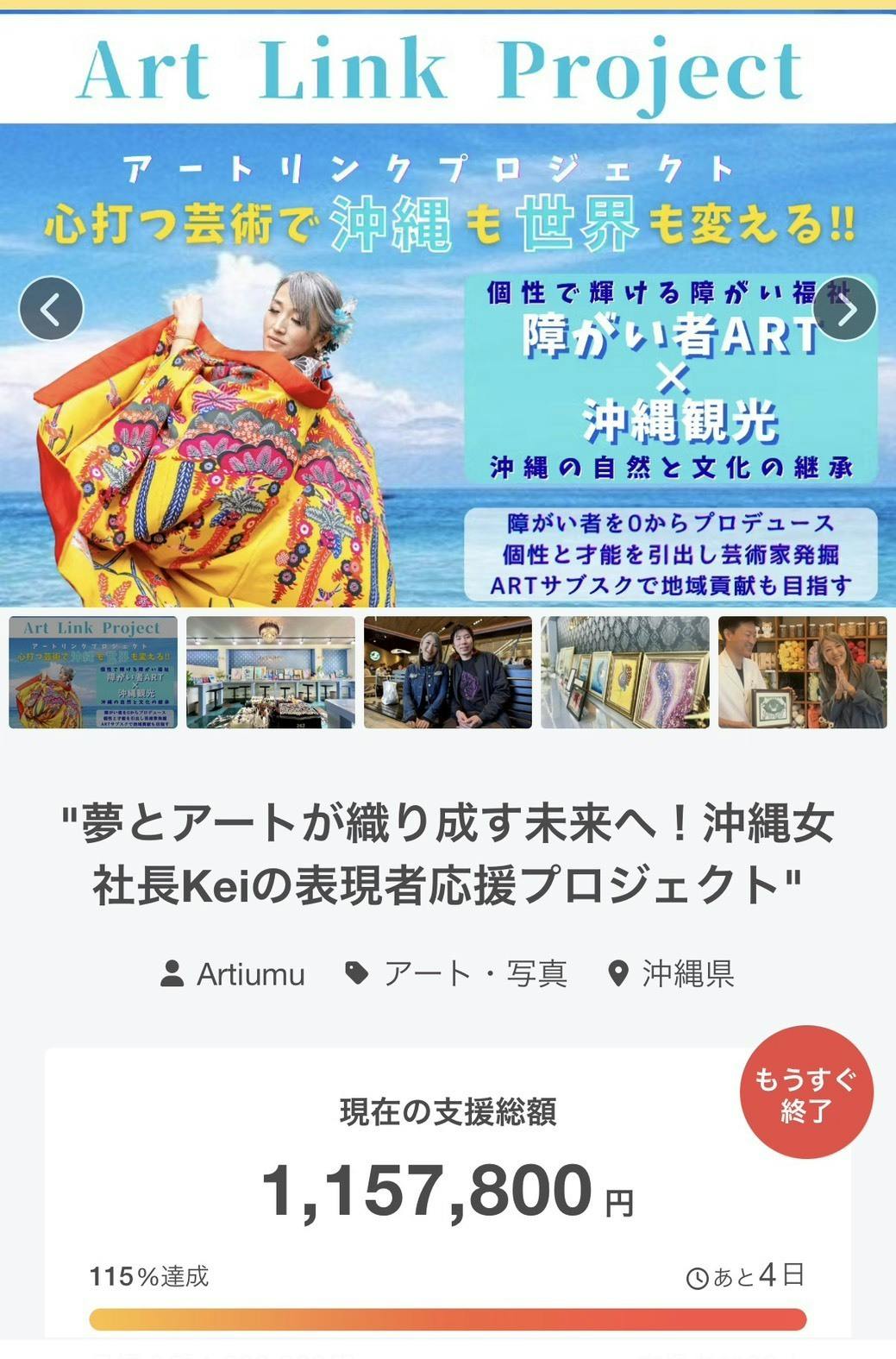 2025/12/09 20:16皆さまの応援のおかげで、支援者86名・支援総額115%達成!!本当に本当にありがとうございますたった1人でも欠けていたら、ここには辿り着けませんでした。85名の皆さまに、心から感謝です。そして…クラファン終了まで《あと4日》!!ここからは、✔ もっと多くのアーティストへ✔ もっと多くの展示の場へ✔ もっと多くの「表現できる未来」へ次の目標は、「支援者100名」達成です☆すでに応援してくださっている皆さま、そして、これから出会う皆さまへ。最後の4日間、応援・シェア・お声かけどうか力を貸してください!!ラストスパート、全力で走り抜けます^^ もっと見る