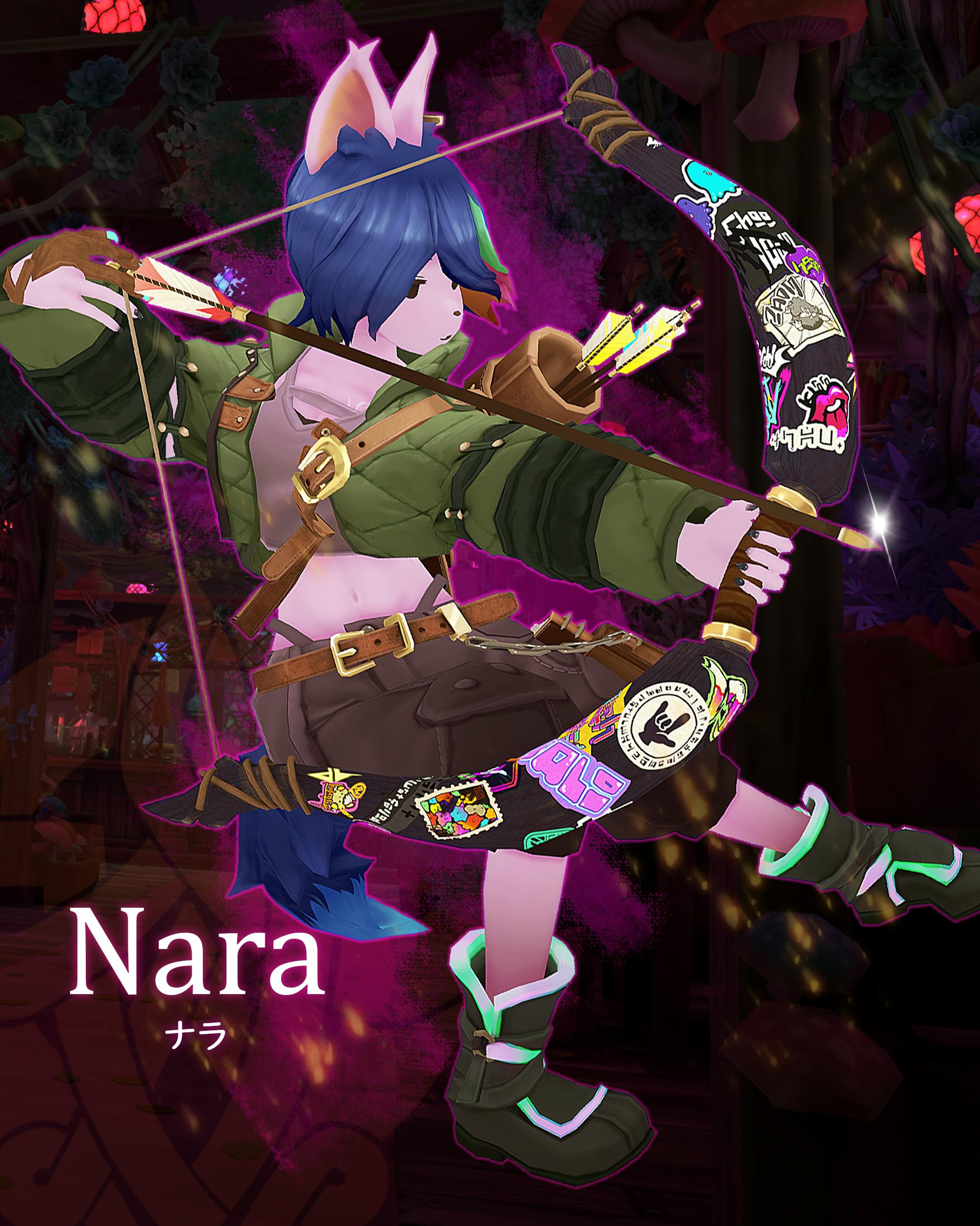 ナラは「エルダ族」の闇のドルイド。エルダの中で禁止されている術を集め、それらを図に落とす「アート」活動をし、フィオナ騎士団の戦いをサポートする心強い仲間として登場します。