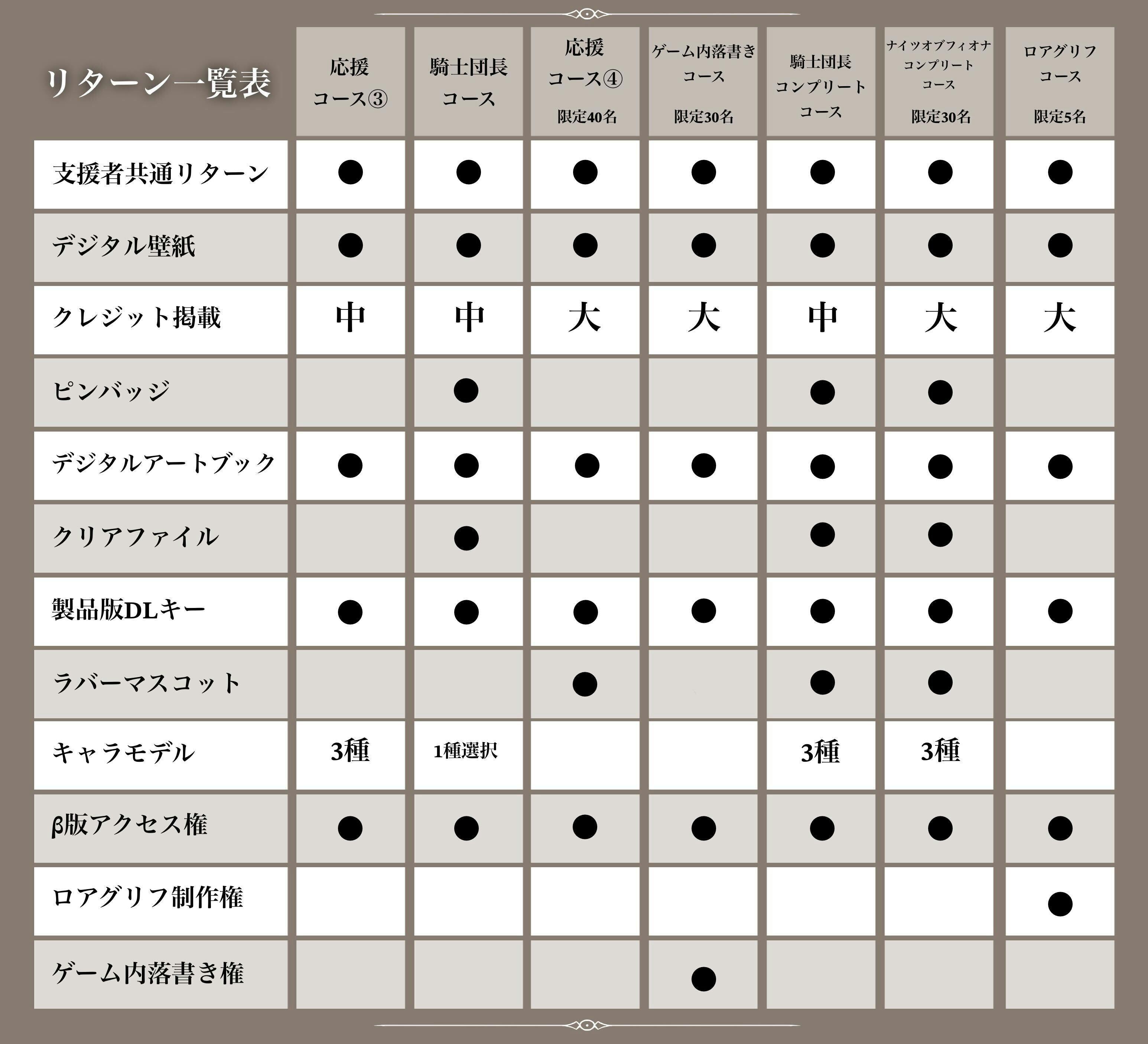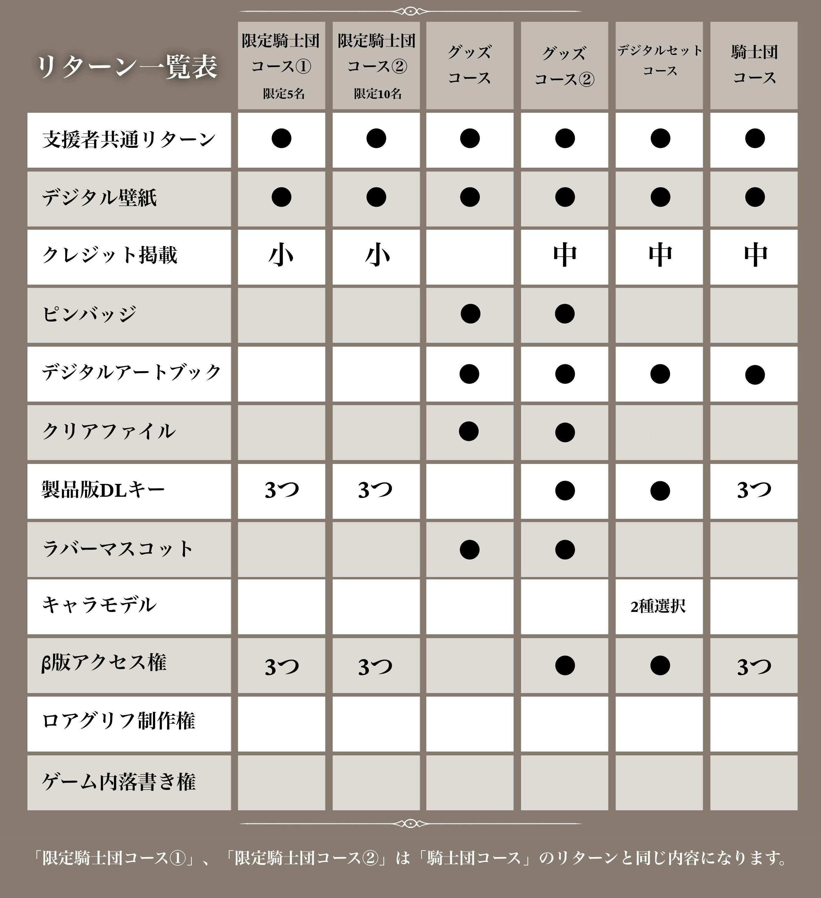 ※「限定騎士団コース①」「限定騎士団コース②」は「騎士団コース」のリターンと同じ内容になります。