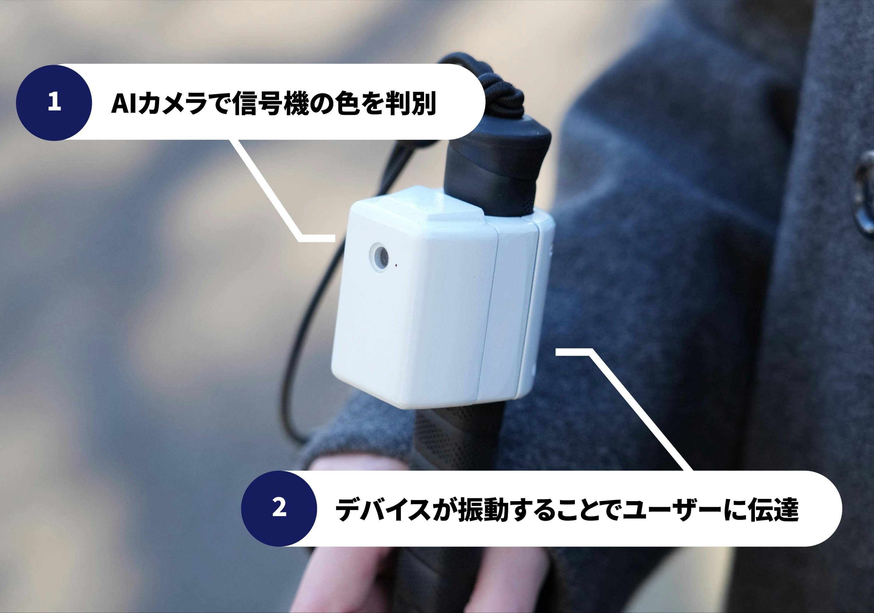 AIによる画像認識を用いて、歩行者用信号機の赤青を判別、デバイスの振動パターンでユーザーに信号機の状況を伝えます。