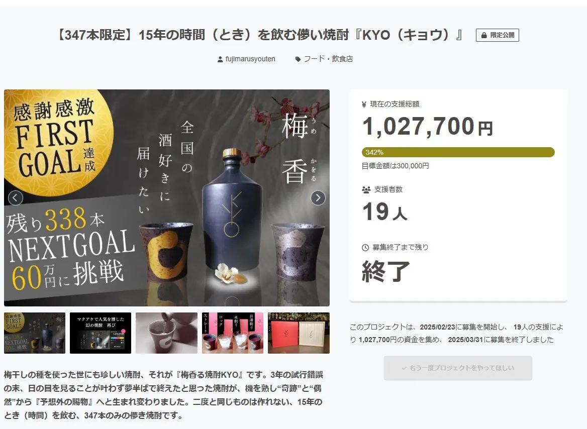 あれから15年経った2021年のこと。たまたま、百貨店の催事に出展されていた、KYOを作った酒蔵さんの責任者とバッタリ出会いました。一言挨拶を交わしたその後に、あの梅香る焼酎KYOが世に存在していることを告げられました。