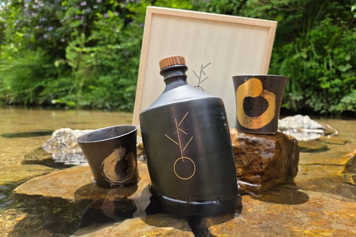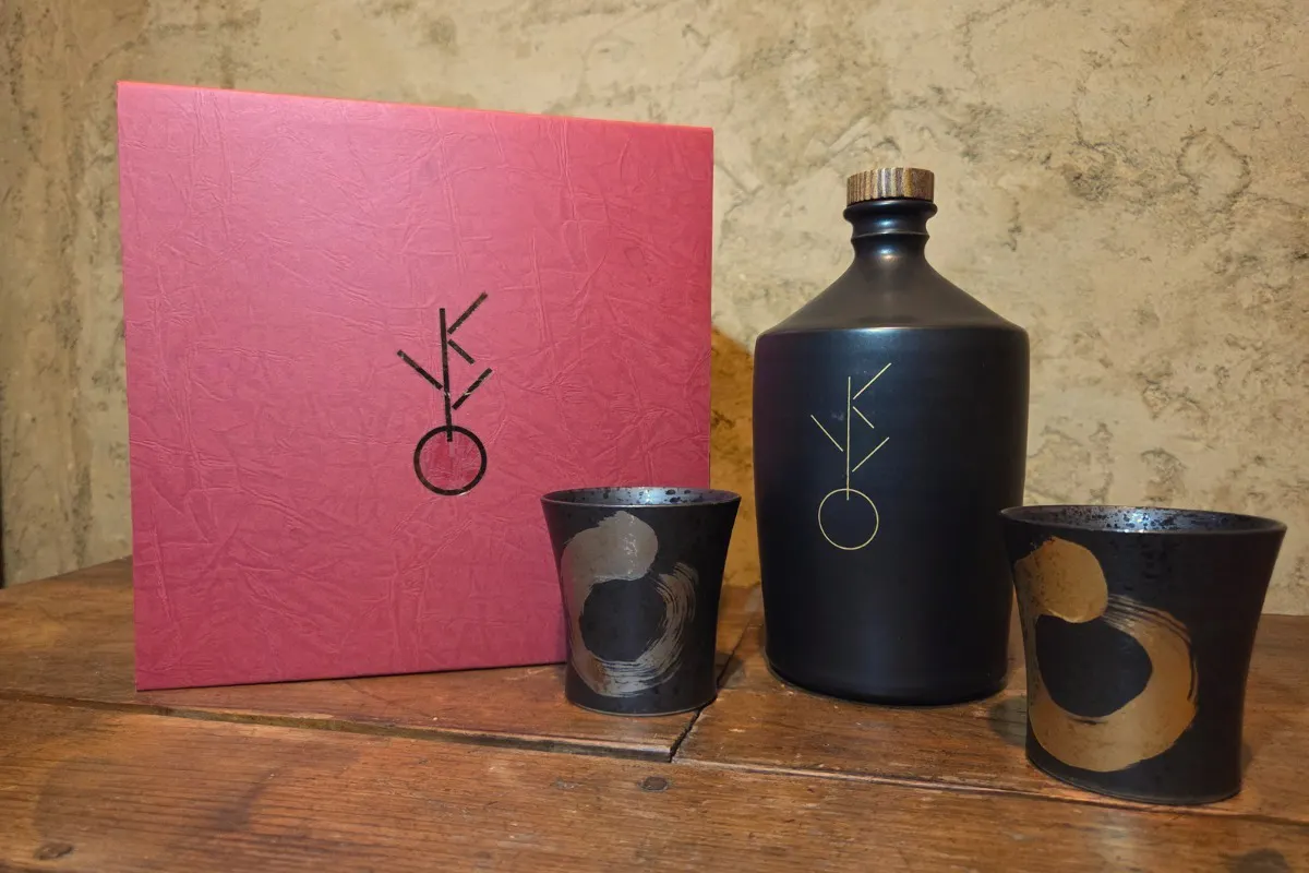 だからこそ、最後の最後だけでも特別なもので着飾ってあげたい。親心として、嫁入り道具を持たせる。その想いで、特注ボトルにKYOを注ぎ、ぐい呑みセットをお付けしてお届けいたします。