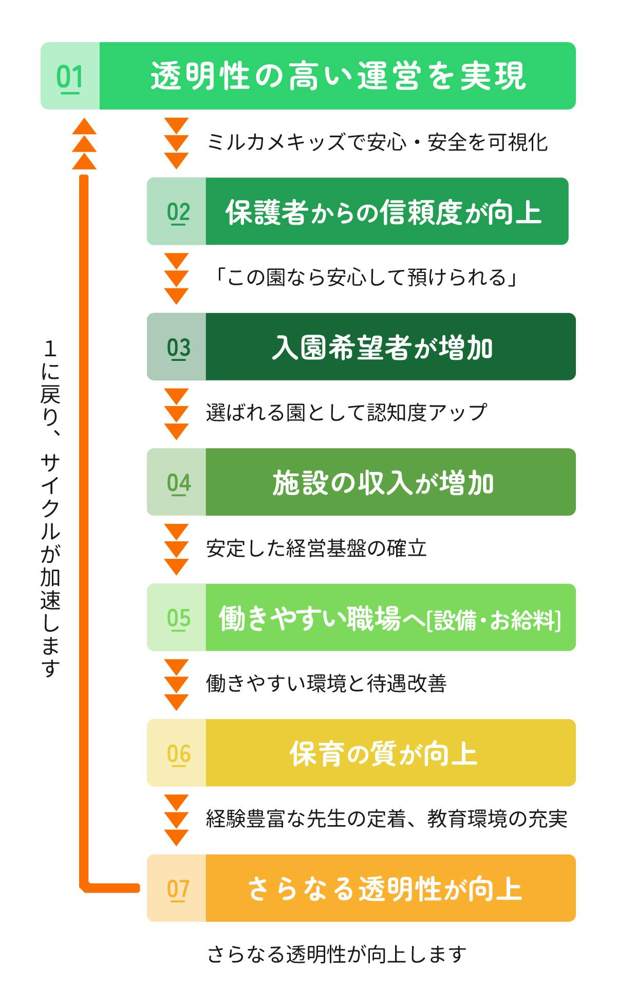 このサイクルが回ることで、園にとっても保護者にとっても、そして何より子どもたちにとっても良い環境が作られていきます。