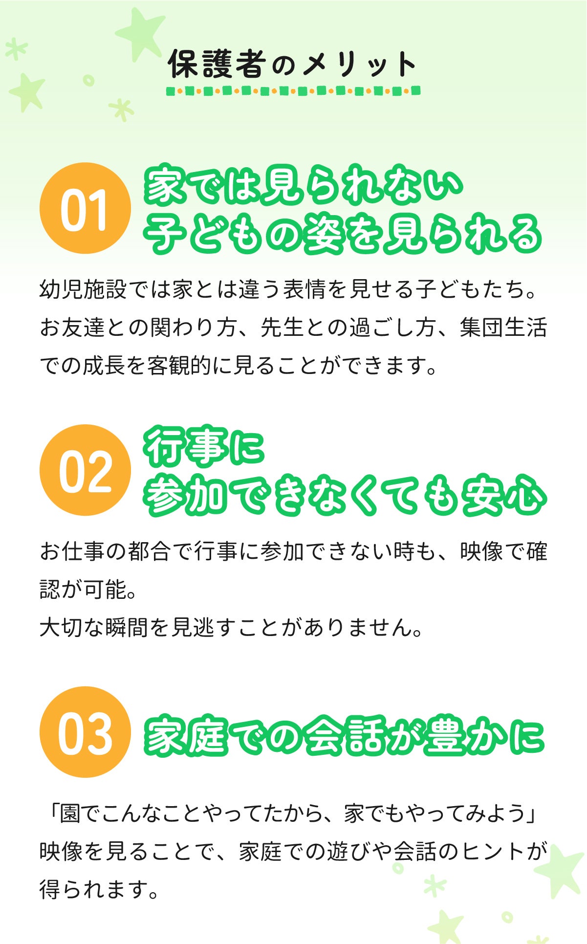 先生との対話や連絡帳だけでなく「映像」で我が子の様子を知ることで、子育てはもっと豊かになると信じています。