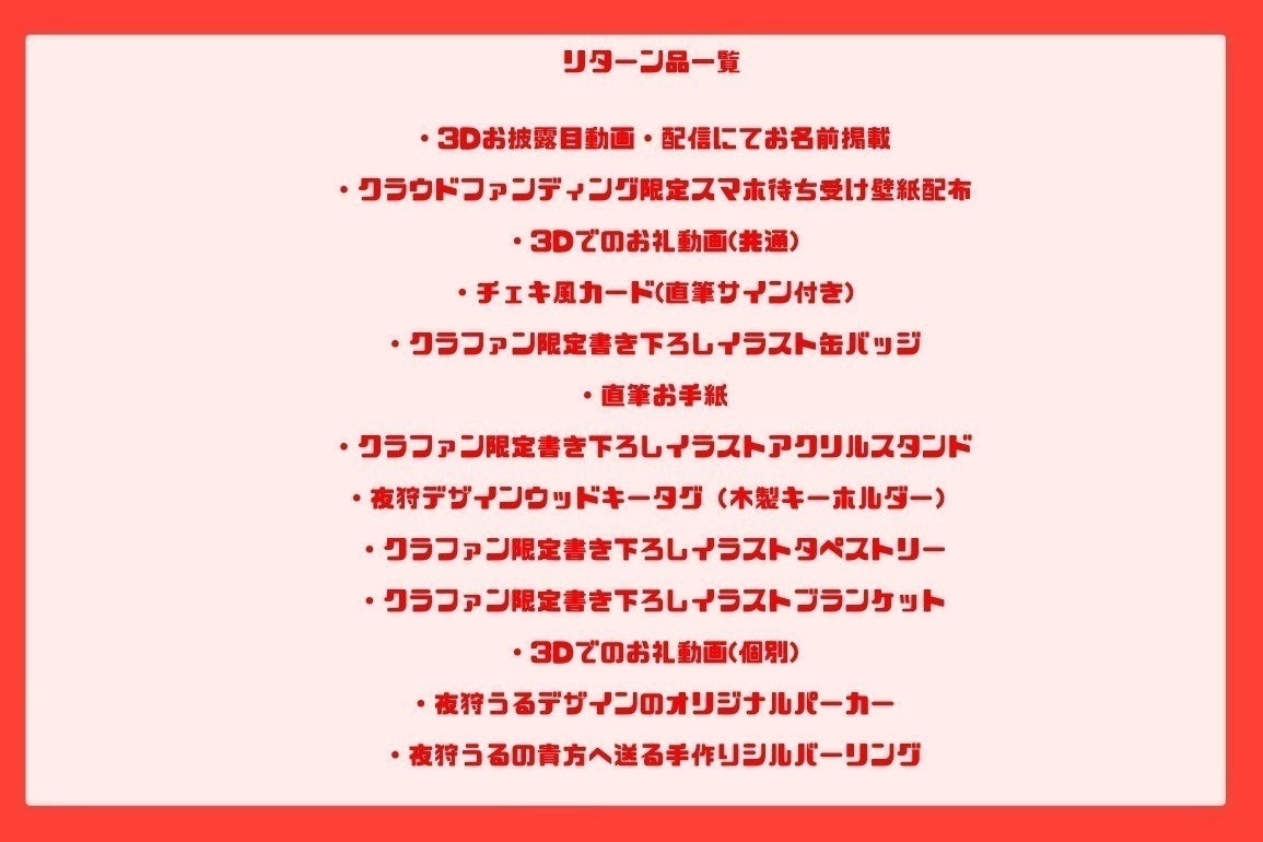 11月 リターン品準備次第発送開始(3Dお礼動画除く)