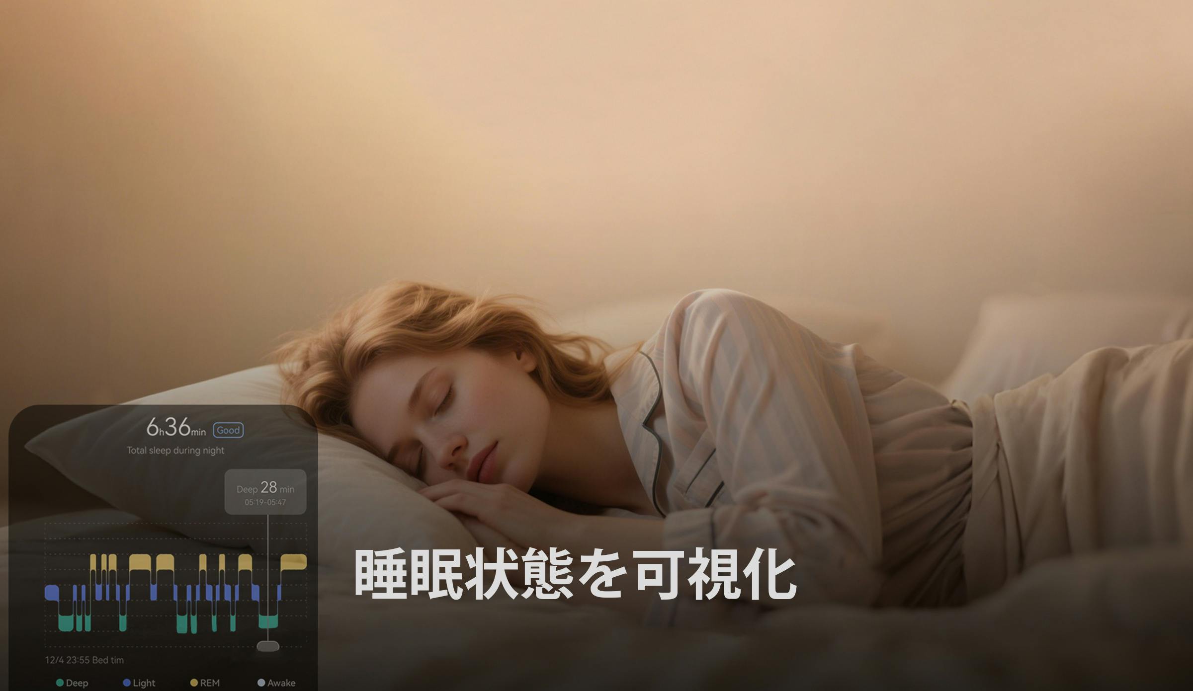 目覚め、レム睡眠、浅い睡眠、深い睡眠の各ステージをモニタリングし、睡眠中の心拍数、血中酸素濃度、HRVなど多パラメーターをリアルタイムで測定。睡眠の質を分析し、身体状態回復レポートを提供します。