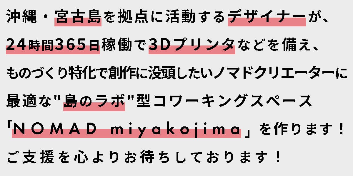 このクラウドファンディングで実現したいことは、3Dプリンタや大判プリンタを備えた少人数制のコワーキングスペース「NOMAD miyakojima」の開設。